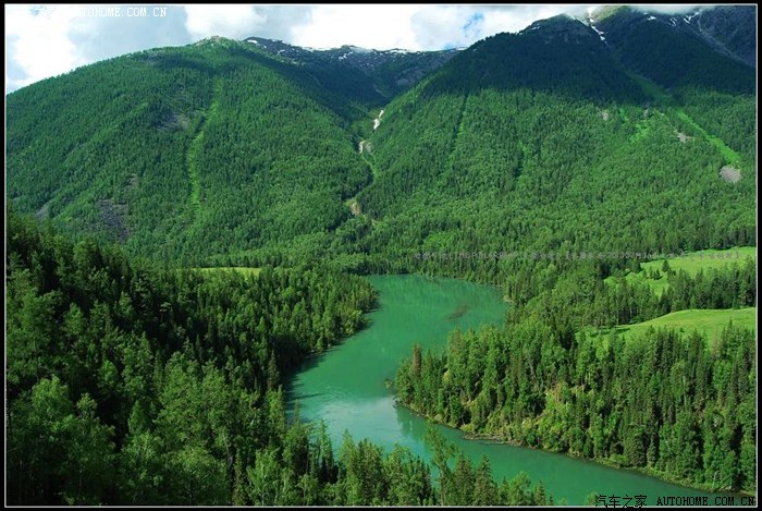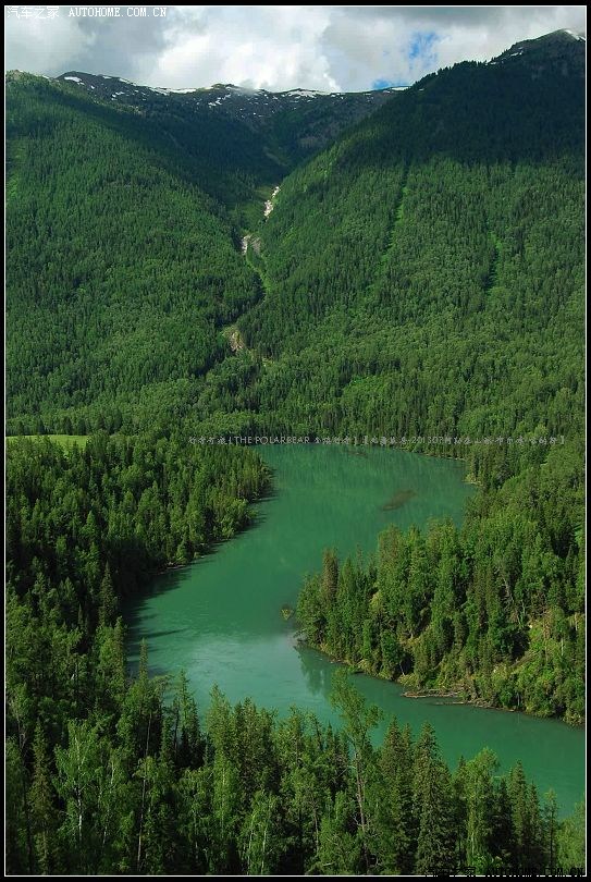 ~~~新疆布尔津喀纳斯湖国家地质公园是一个以第四纪冰川作用、地质构造作用、水动力作用和地质地貌景观为主,~~~~以自然生态、人文景观为辅,以高山湖泊、河泫滩流、 森林草甸、 草原民族文化相映成趣为特色的集科学价值与美学价值于一体的综合性地质公园~~~~喀纳斯河段‘月亮湾’的一角~~景区内的公路虽然路况很好但是很出奇的窄~~~不知为什么这样设计~~~区间车假如要错车的话非常的局促~~~少数‘特权’自驾车也夹在其中显得‘很有面子’~~~~
