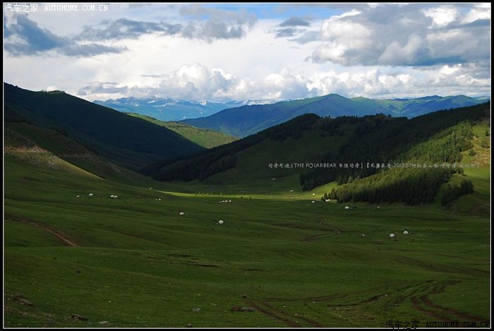 ~~~~壮美绵延的阿勒泰山脉~~~无垠沟壑纵横其间~~~辽阔的高山草甸上~~白色毡房星罗棋布~~~好似洒落绿色毛毡上的粒粒珍珠~~~~黄昏的斜阳透过厚厚云层~~~~斜刺里往草甸上射下夺目光斑~~~