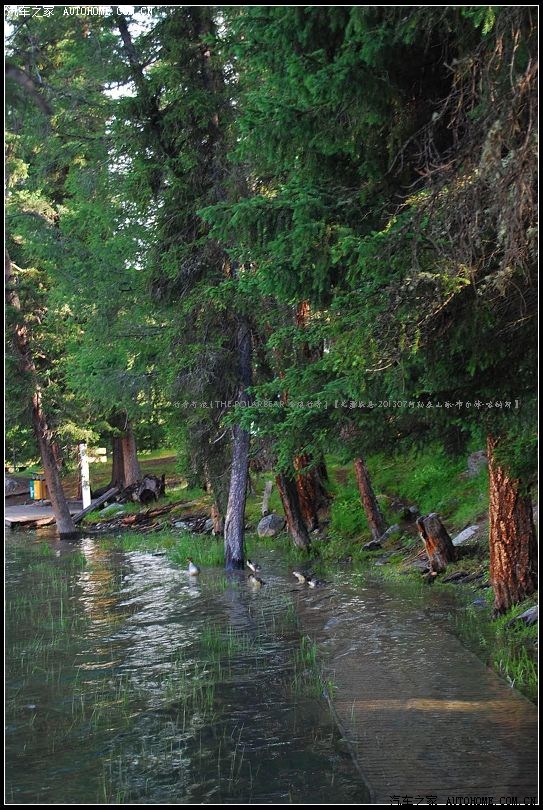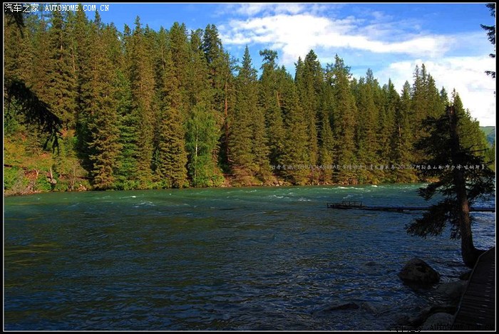 ~~~喀纳斯河是布尔津河的主要支流,河的上源就是喀纳斯湖。湖水倾泻而下,在山谷中蜿蜒,形成了卧龙湾、月亮湾等秀丽绝伦的水湾河滩。湖面碧波万顷,群峰倒影,湖面还会随着季节和天气的变化而时时变换颜色,是有名的“变色湖”。~~今年的雨水丰沛~~河水水位较往年同期大涨~~~河畔的栈桥有些已经没入奔涌西流河水中~~~