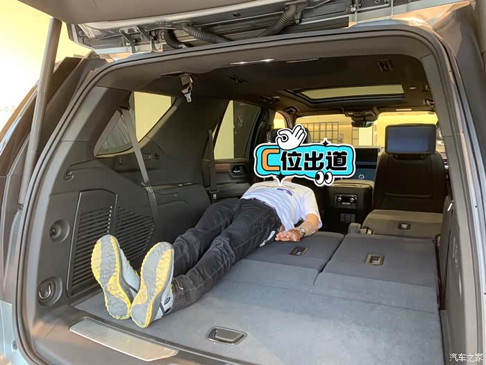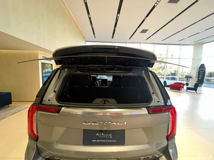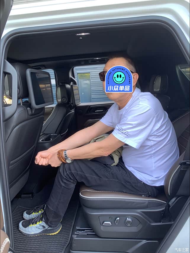 正面大嘴立体盾形格栅非常霸气,红色GMC格外显眼。5357x2058x1940尺寸,我180身高在它面前都格外渺小。后备箱打开方式也很人心化,上部玻璃部分可单独打开方便取东西。座舱镶有实木内饰,全包真皮大沙发非常舒服。二三排座椅电动放倒后非常平,简直就是天然大床房。