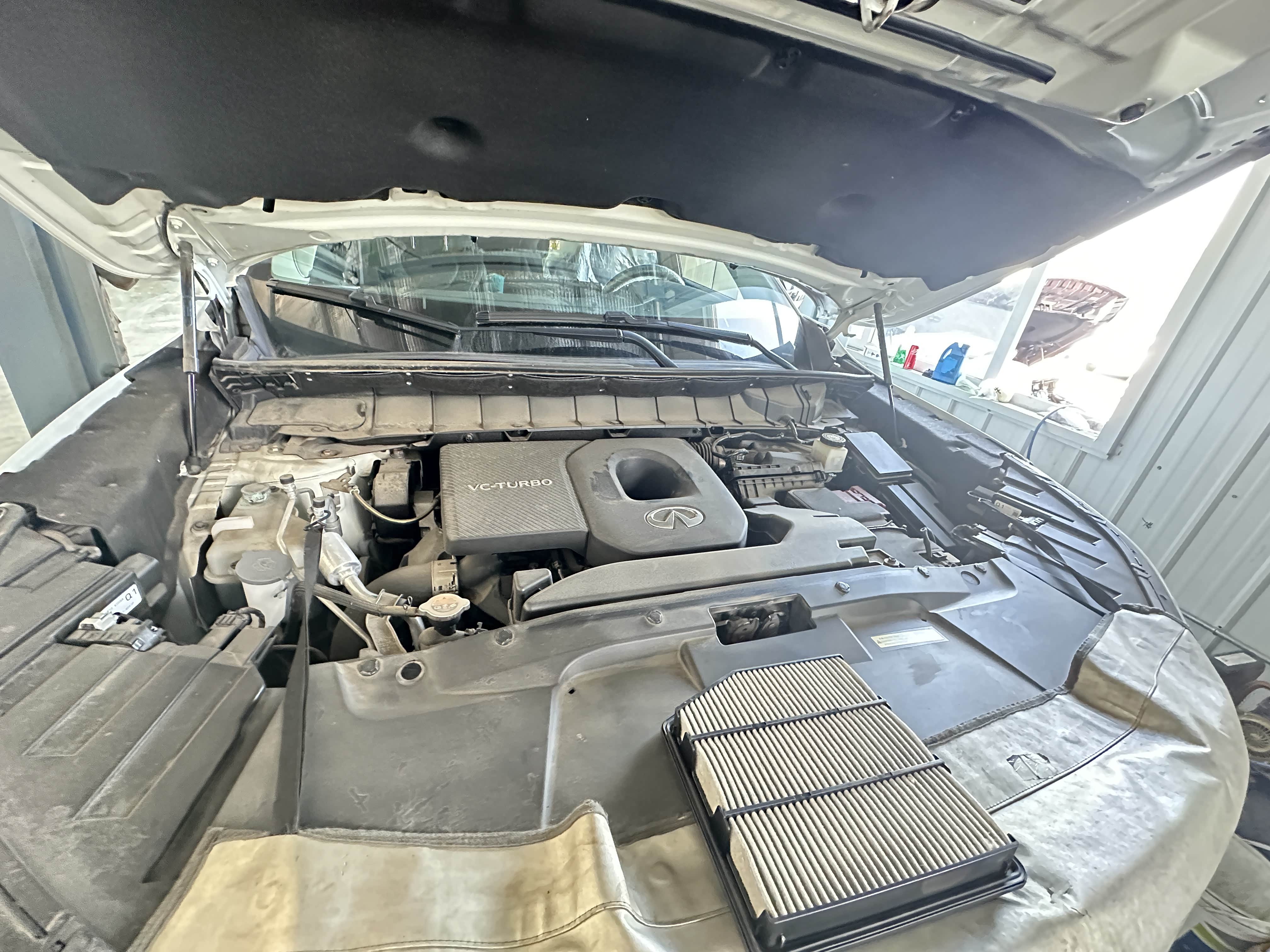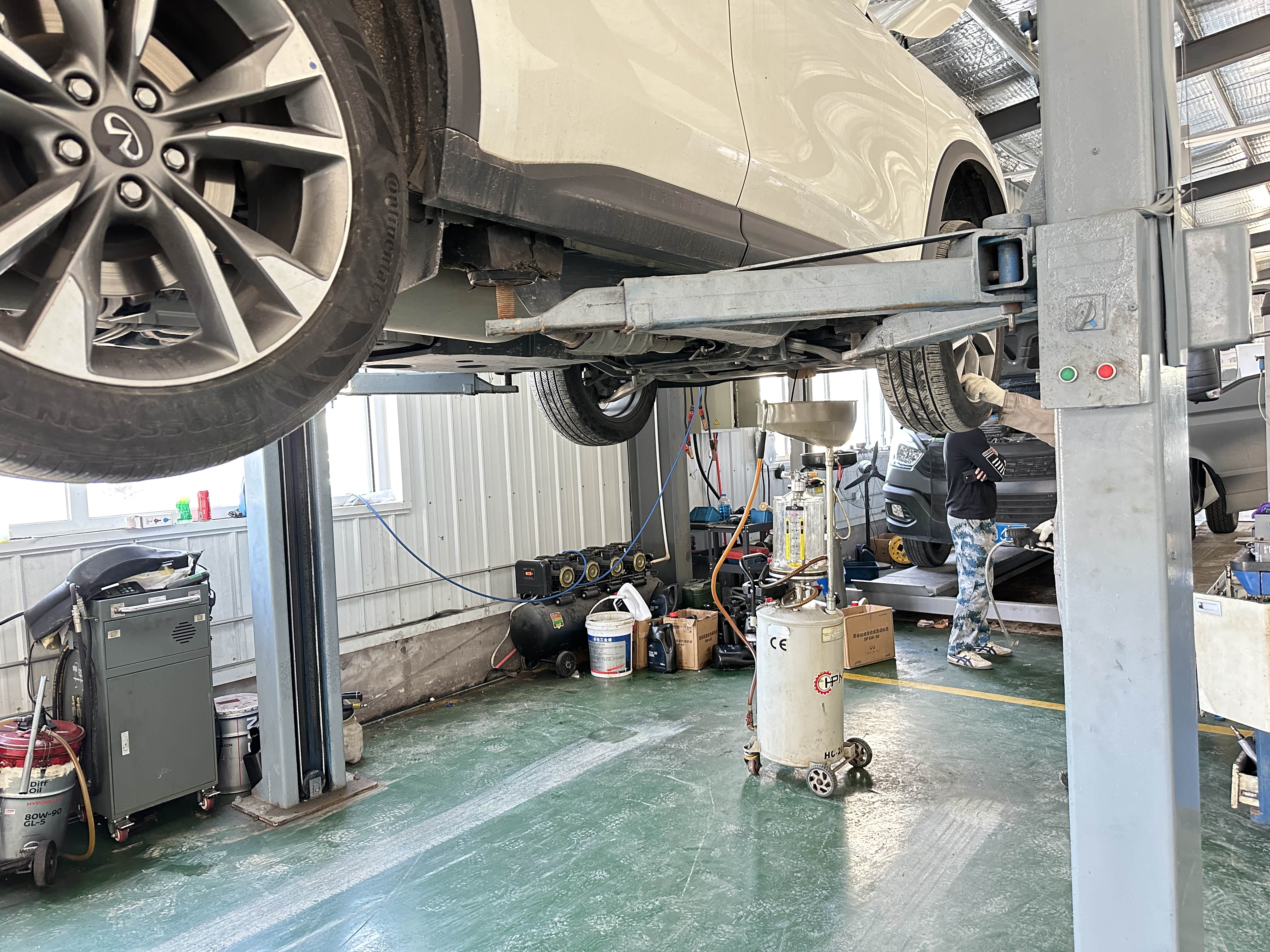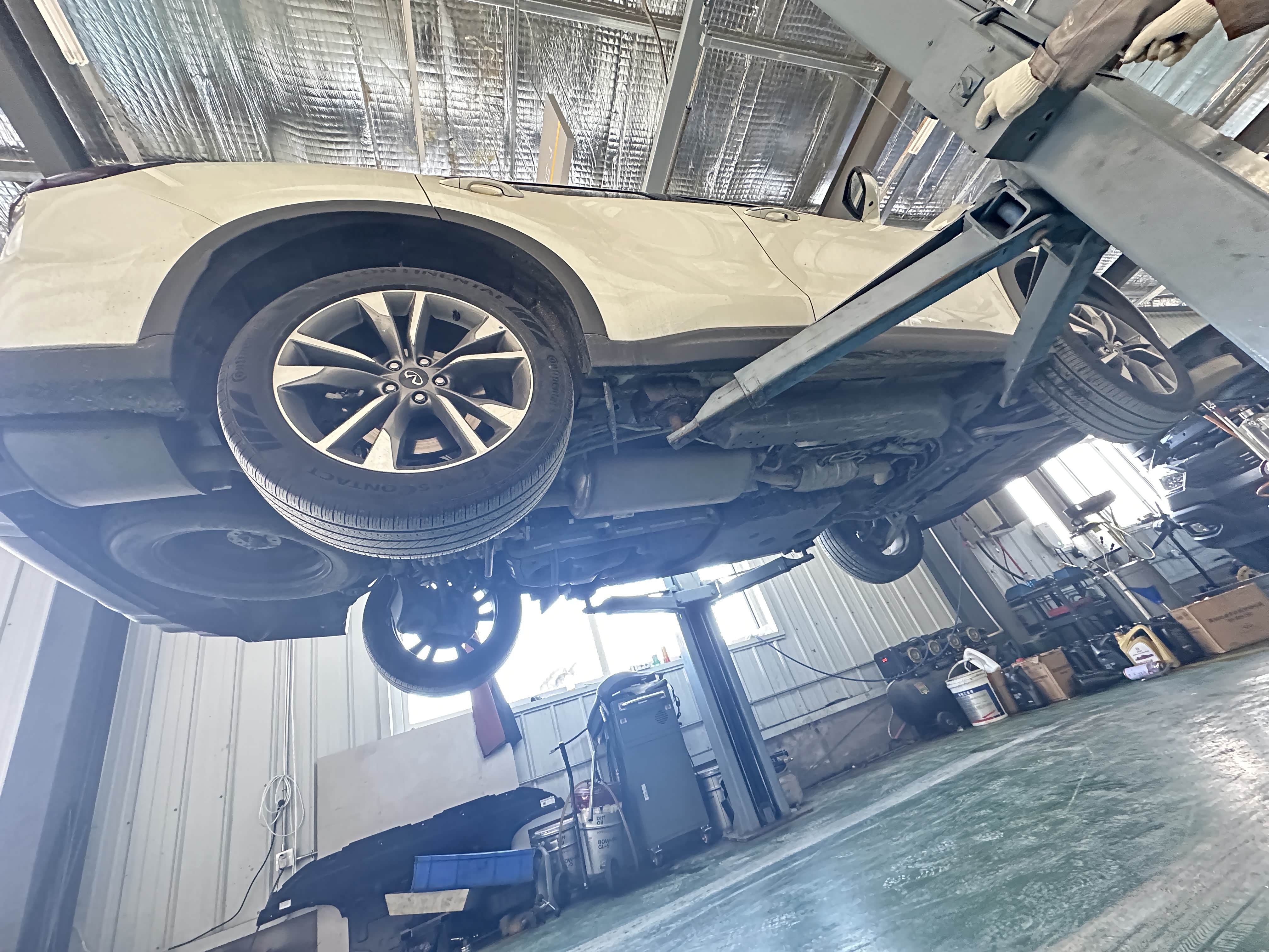 到了4S店和接待的老弟聊了下车子接下来给我规划出一整套细致的保养,然后将爱车开进车间工位开始保养作业。由于我这辆车是自动恒温空调所以空滤必须要勤换。然后上大架直接举高高,开始更换机油机滤。要说QX60的底盘是真心不错,不单单是平整无凸起其底盘耐腐蚀程度超赞。由于我生活在海滨城市大连常年比较潮湿但当时提车并没有喷底盘防锈,而两年过去了底盘和刚提车时几乎一样没有任何锈蚀,耐腐蚀程度杠杠的。不过能更好的呵护底盘我还是喷上一层装甲防止腐蚀底盘。