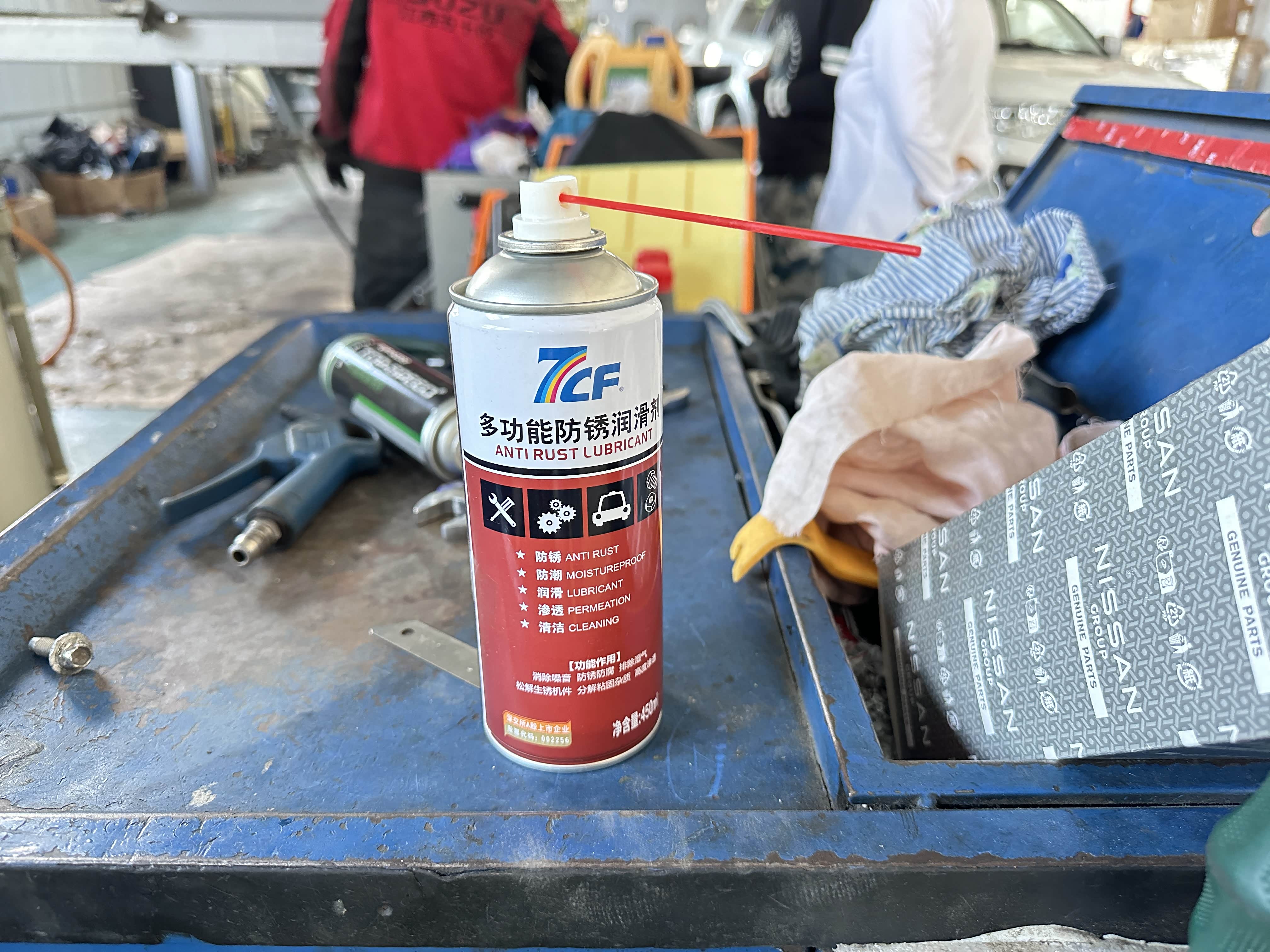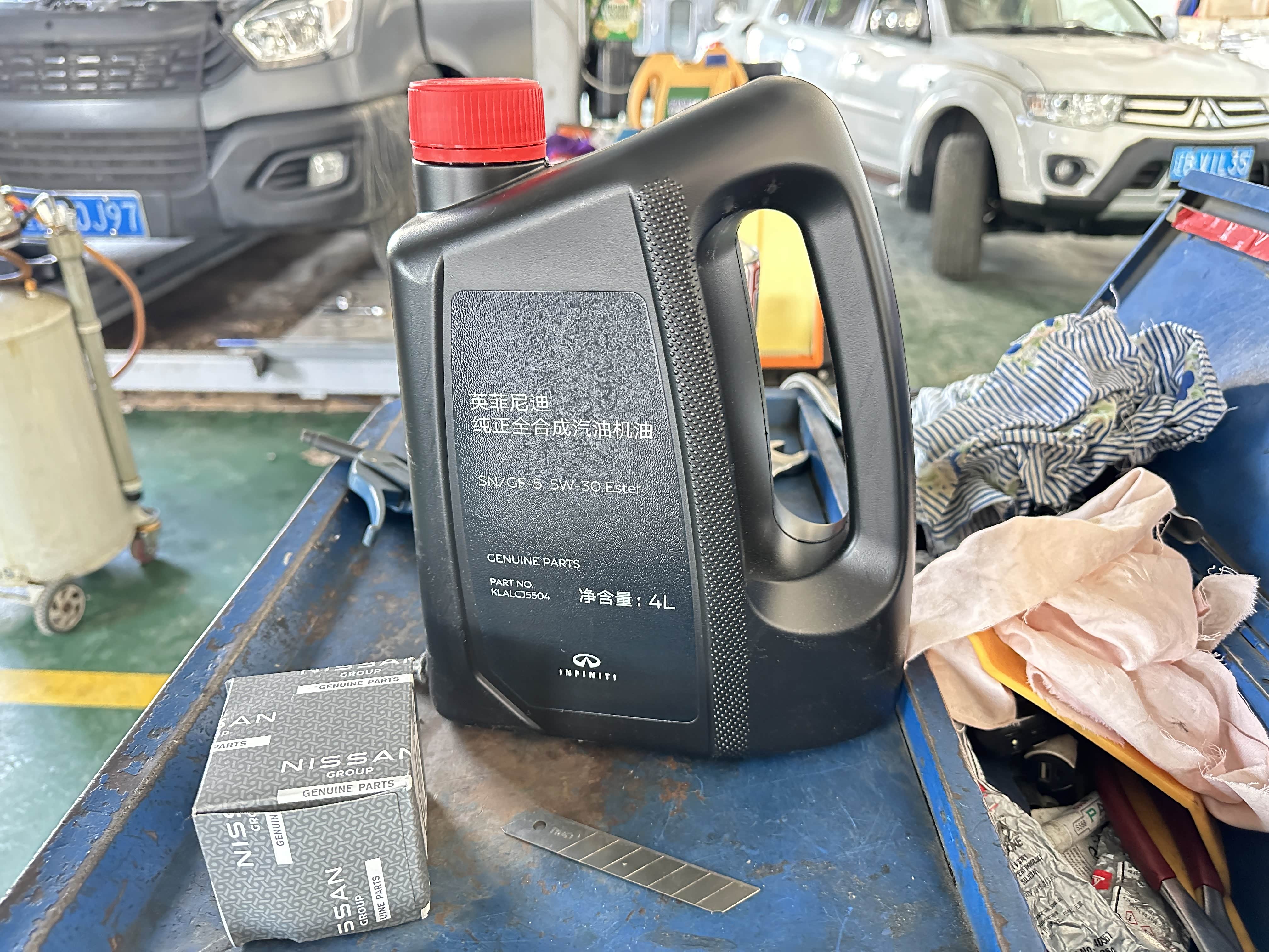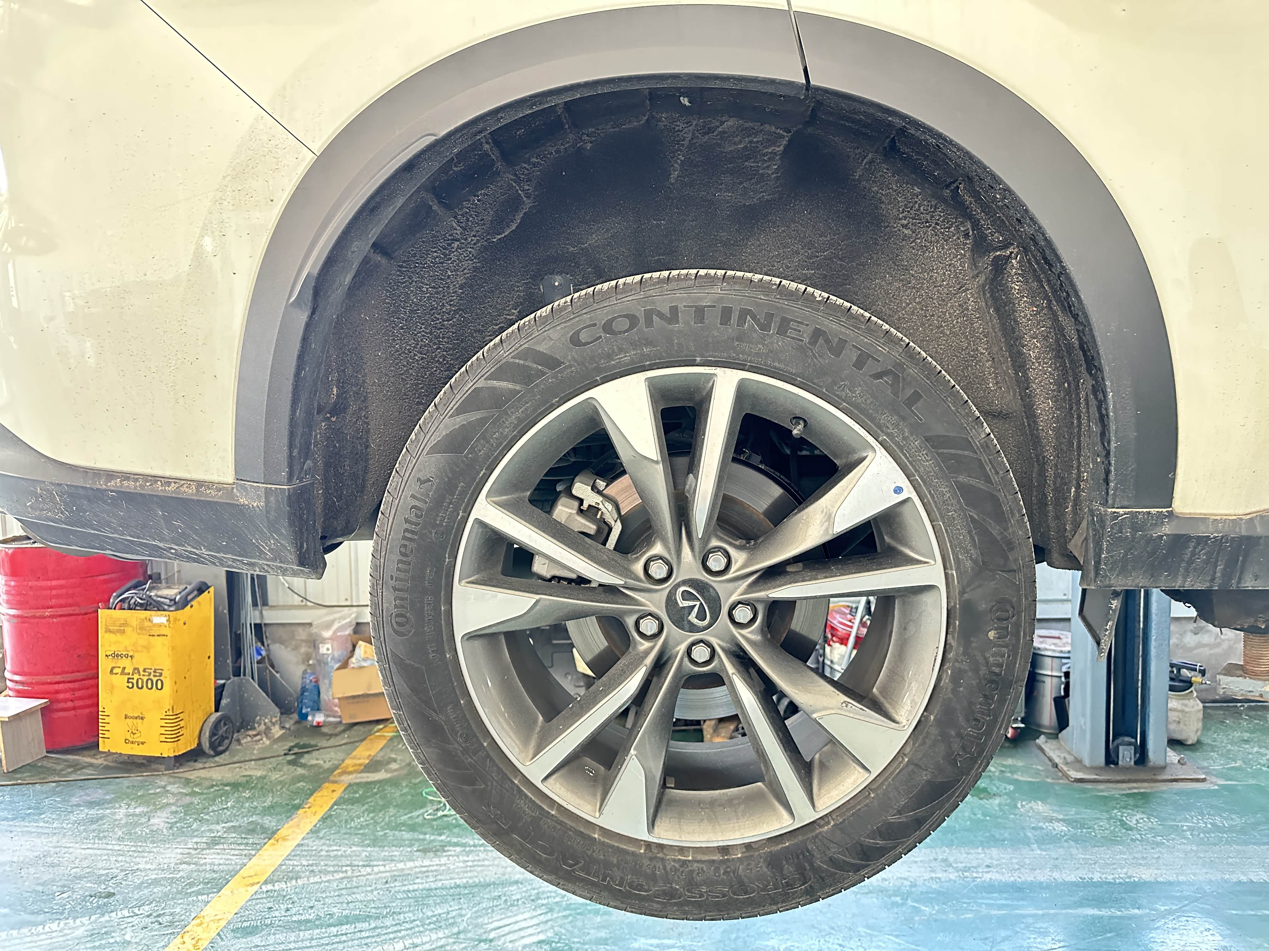 到了4S店和接待的老弟聊了下车子接下来给我规划出一整套细致的保养,然后将爱车开进车间工位开始保养作业。由于我这辆车是自动恒温空调所以空滤必须要勤换。然后上大架直接举高高,开始更换机油机滤。要说QX60的底盘是真心不错,不单单是平整无凸起其底盘耐腐蚀程度超赞。由于我生活在海滨城市大连常年比较潮湿但当时提车并没有喷底盘防锈,而两年过去了底盘和刚提车时几乎一样没有任何锈蚀,耐腐蚀程度杠杠的。不过能更好的呵护底盘我还是喷上一层装甲防止腐蚀底盘。