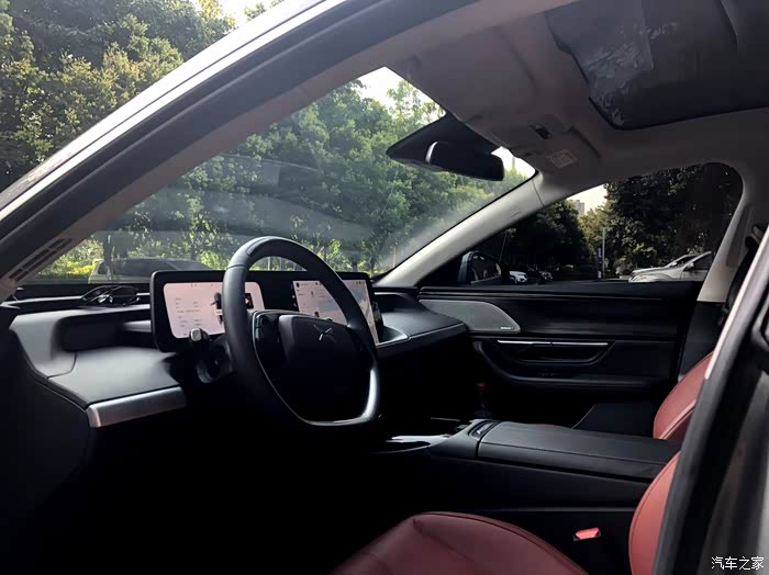 车门是无框玻璃,内饰也相当有质感,真皮座椅,前排可以多方位调节,自动记忆功能一开始有点“吓”到我,因为每次坐上去和离开座椅座椅都会“动”,习惯使用开始觉得,这个功能真人性化。视觉上最吸引人眼球的是两款大屏,一块10.25英寸的仪表盘,一块14.96英寸的中控屏,人机交互上很不错,基本挑不出毛病。