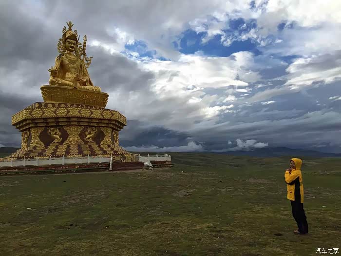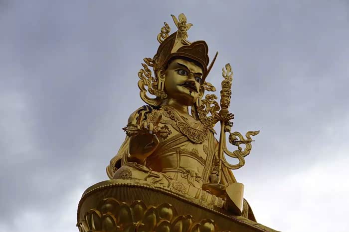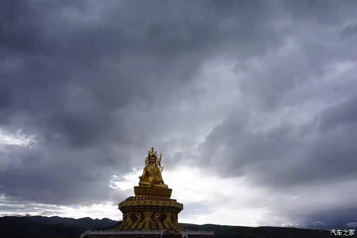 山坡上有一尊很高大的莲花生大师金身像,伴随着风云变幻,很是威风。
