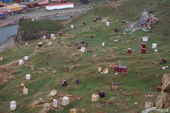 靠近觉姆岛的山坡上有一个个散落的小方盒子,是闭关打坐的修行屋,单个木箱改造的,用于冬季的百日闭关。