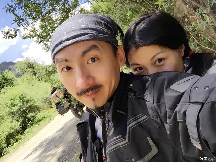 白玉县往南10公里柏油路之后,右转进入连续60公里土石山路,山路很窄,全程颠簸,一开始还尽量站着骑来减轻车身颠簸和增加平衡度控制,后来累的站不动了就站一会儿坐一会儿。坑最多最深的地方把我和后座的小妞轮番从大野驴座位上弹了起来。最难的是在狭窄的碎石路上爬坡拐回头弯,满路的碎石子儿让前后胎轮番打滑,加上车身后半部分的沉重行李让爬坡时重心非常靠后,就像尾巴上带了个大铅球,稍有不慎就会翻倒。有了昨天的经验,心里清楚的知道千万不能在碎石坡上倒车,靠我们两个人完全没机会扶起倒在碎石坡道上的大野驴,抬起一点儿就溜着碎石往下滑,完全控制不住,而且山里完全没有手机信号,移动联通统统没有,所以今天的目标是不能倒车!尤其是在碎石坡上。拐回头弯的时候用低档位捏离合猛轰油门拉高转数,利用陀螺仪效应保持车身平衡,然后迅速放开一小点离合给猛劲儿往坡上边拐边蹿,后轮飞弹着碎石子打着滑,蹿一小步捏紧离合停一瞬间,控制好平衡再轰油门蹿一步,再捏紧离合停一瞬间,就这样一点点蹿上回头弯,居然真是全天没有倒过车,及格交卷。但是这样拉高转数的攀山方式让大野驴的发动机温度迅速升高,这60公里山路上有三次都跑到大野驴水温报警,防冻液温度表满格爆表,发动机瞬间停转,罢工!只好找一片树荫把大野驴推到下面乘凉,冷却20分钟之后再继续前进。