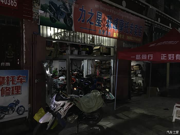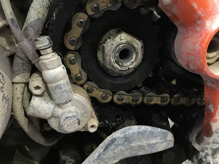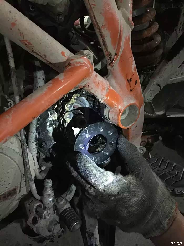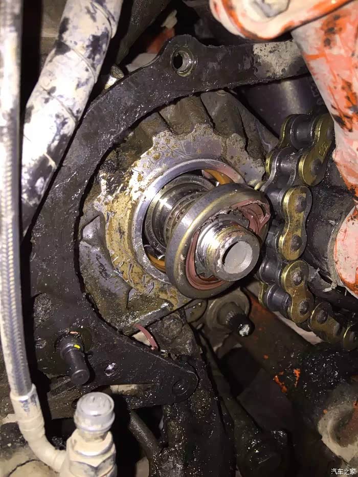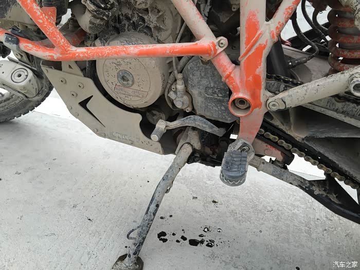 到最后一段水泥板路上的时候,小妞发现车在漏机油,一路坚持到巴塘,在县城里找到一个看起来还不错的摩托维修铺子,老板检修后发现是链条前端的小牙轮背后的油封被随链条卷入小牙轮的一块编织袋碎片磨坏了,这个位置的油封坏的非常少,修车老板都说这些年修过那么多摩托没见几个坏过的,只怪我们跑的路太烂了运气又不好。但是当晚在巴塘当地没找到尺寸匹配的油封,机油也几乎漏光了,只好求助北京和成都的4s店,期待明天能顺利找到油封,不要影响行程。