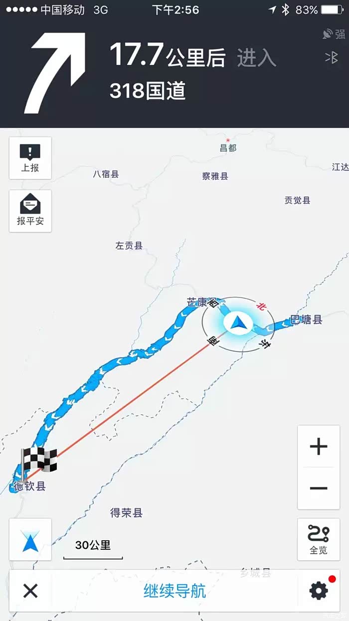 山里穿越出来之后再跑50多公里水泥板路,之后就进入大家最熟悉的川藏南线318国道了,这一段318国道比14年来的时候修的更好了,尤其是没有信号没有人烟的野路上颠簸了大半天之后,看到平整的柏油路就跟到了外星球一般。