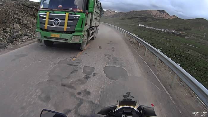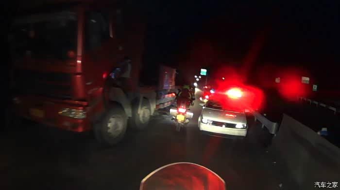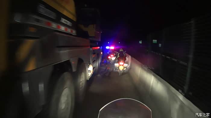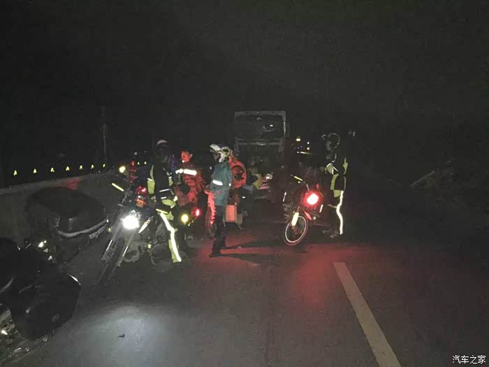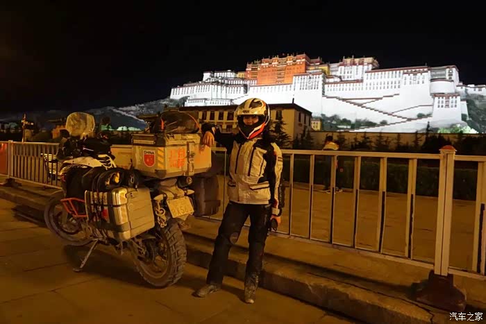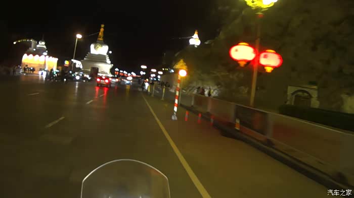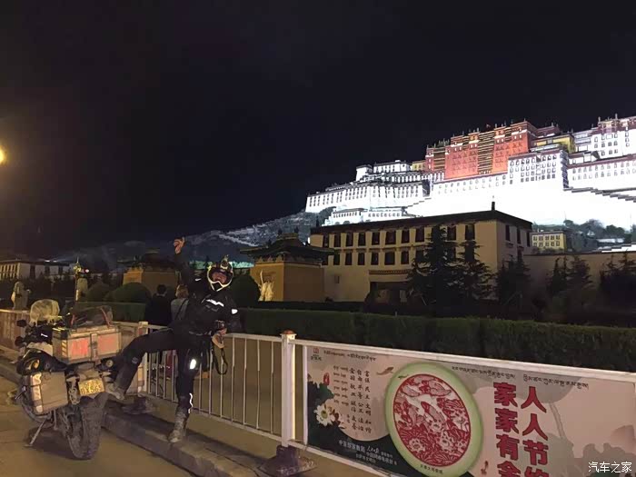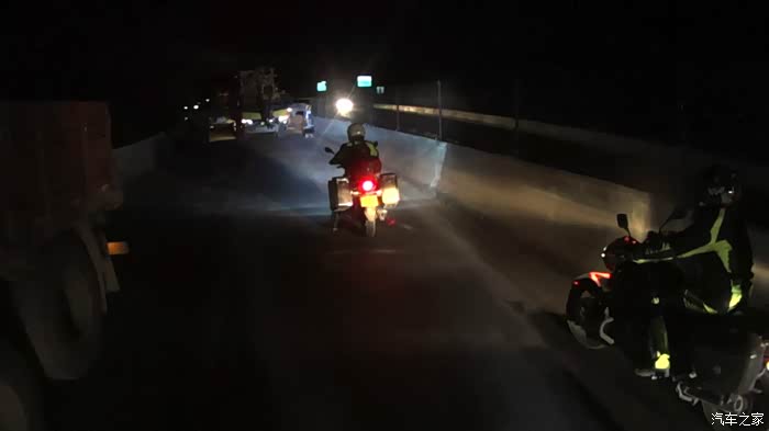 一路风雨颠簸到夜里9点多,在离拉萨50公里的国道上,跟一众风尘仆仆的摩友被堵在了路上,国道是双向单排道,并不宽,一辆大吊车支开四爪占了整个道路,在捡掉落在路边树丛里的一捆捆钢筋,来去两边都排了几十辆车等待通行,等到晚上10点左右,吊车完工后刚一收四蹄,一众摩托车就溜边通过,这就是摩托的灵活性,开车的话要等吊车整备完成才够宽度单边放行。