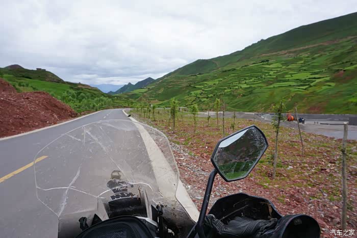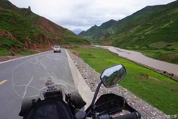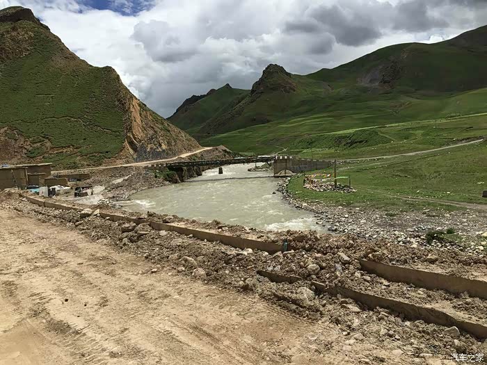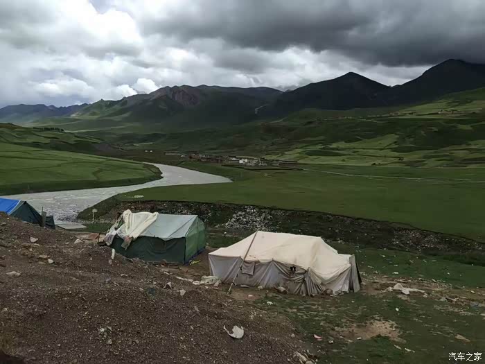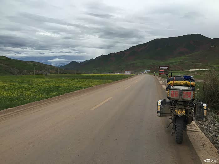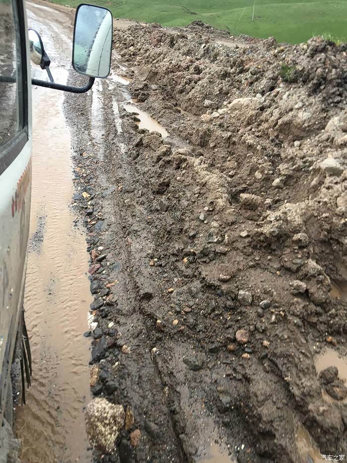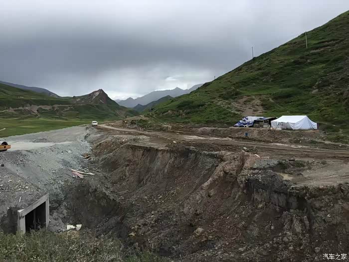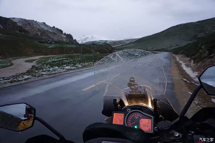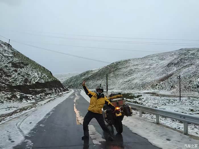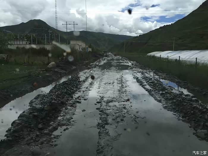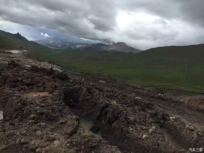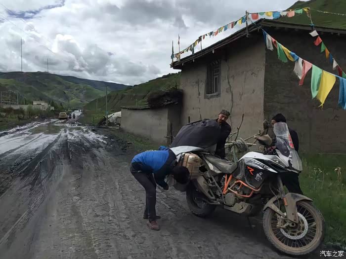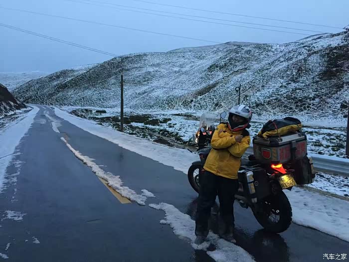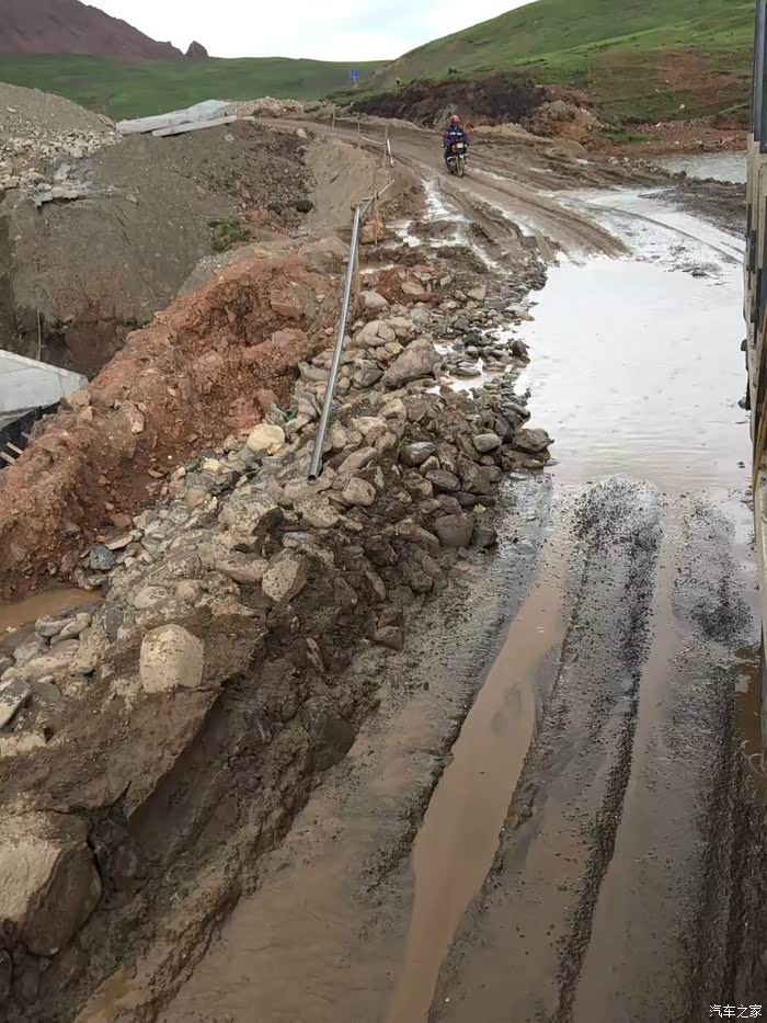 傍晚的时候开始翻越支格拉山,先开始远远看到白白的雪山感觉好凉爽,跑着跑着发现周围都是积雪,然后就开始翻越阴云密布的雪山了,因为海拔只有4700米,没这个心理准备。7月份,大夏天,乌云满天白雪遍地,我们跟闯进了魔多一般,北京当天30多度,支格拉山上只有3度,真是冷!下山路上天色已黑,车灯前方照出一片反射亮光的水坑,历经这么多烂路,看到水坑毫不在乎,驾着大野驴咆哮着就冲进去了,一进去就发现不对,边打滑边剧烈颠簸,原来全是稀泥和碎石!瞬间被一个大石头颠歪了前轮,一个失衡翻倒在泥潭里,爬起来发现是一大片泥石流。泥石流已经没过靴子,冰水一般的稀泥和着碎石冲进靴子里,冰冷。我和小妞的靴子里都浸满了泥水,在坡道上踩在碎石泥潭里难以发力,加上昨天的泥路苦战耗尽了体力还没缓过劲来,两人拼尽力气实在扶不起倒在泥潭里的大野驴,只好等过路的车辆帮忙。第一辆过路的是个SUV,司机小哥很热情的靠过来想帮忙,无奈打开车门发现稀泥已经快漫到车门里了,他又穿的是矮帮皮鞋,根本无处下脚,看着司机小哥的白袜子,我们很惋惜的表示感谢以后让他继续前行,我们站在冰冷的泥水里继续期待后面的机会。不久后,对面过来了两辆大货车,看到我们招手后就停了下来,看车牌是青海的,第一辆车的司机师傅毫不犹豫的下车走过来帮忙,我们赶紧递上小妞从兜里翻出来的塑料袋让师傅套在脚上,因为师傅穿的也是矮帮的皮鞋,即便套上塑料袋也会腿脚粘泥,但他满不在乎的帮我们把大野驴扶了起来,还帮扶着护送我把野驴驶出泥潭。我们看着他的裤腿和鞋子上的泥水满心感激,师傅钱物都推脱不要,只是笑着说:出门在外,互相帮忙是应该的。我们只好心领了他的好意,目送他们的货车慢慢开走,愿他们一路平安,一生平安!