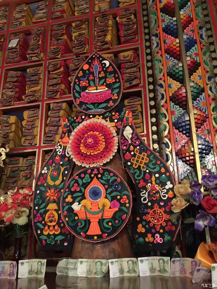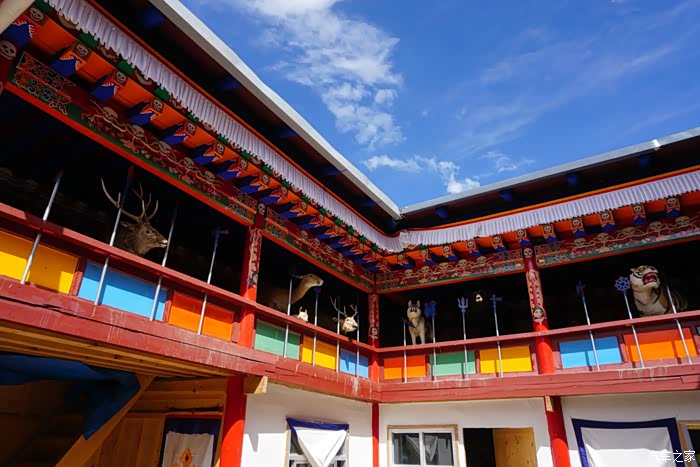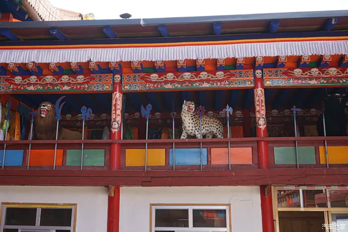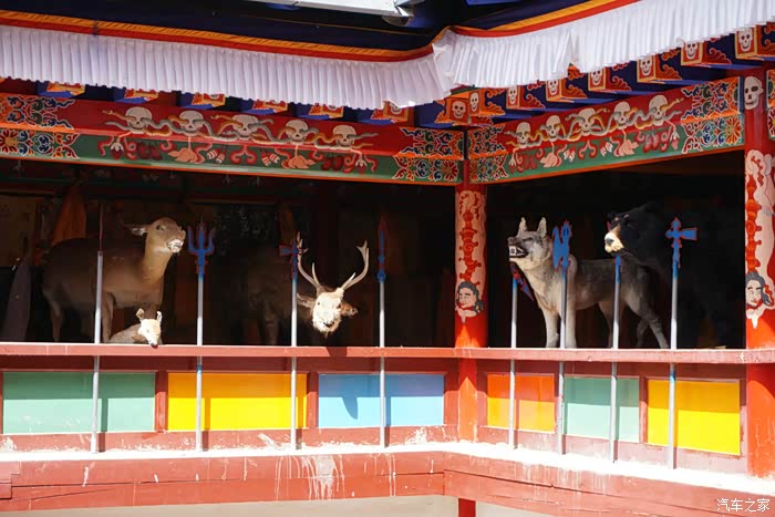 出峡谷后经过一个门口有香炉的大殿,看到有藏民进去朝拜,我们就跟了进去。里面是个被四面围合的院子,冲着院子的二层楼上都是各种动物的标本,我们猜这里供奉某种掌管万物生灵的神明。往里面的大殿里有个老喇嘛,汉语说不清,看到小妞拜了拜神,笑吟吟的送了我们一片风干的花瓣,应该是有祈福的作用,小妞开心的收在了手机壳的内层。