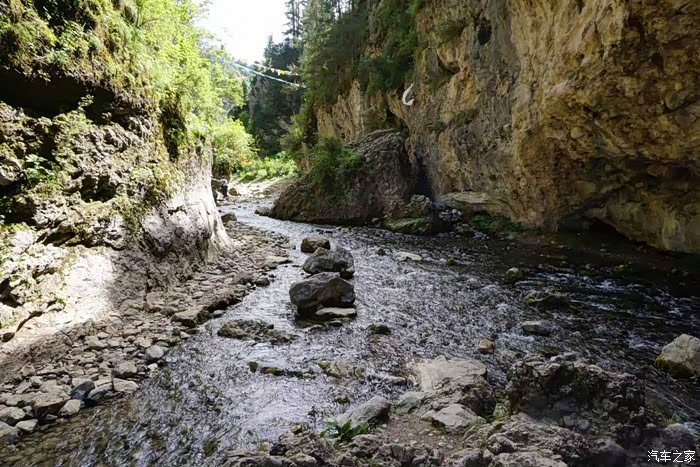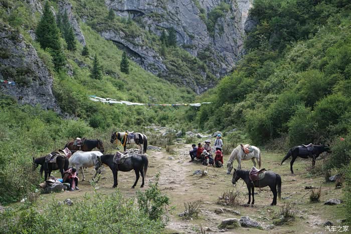 峡谷很深,趟着溪水走到深处,就见到马队在那里等生意,看来峡谷内来回路途很远,骑马才会轻松。据说里面有虎穴和白龙江源头,我们时间有限没有再深入进去,一路走出来准备去探访镇上另一个“郎木寺”。