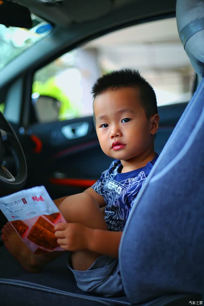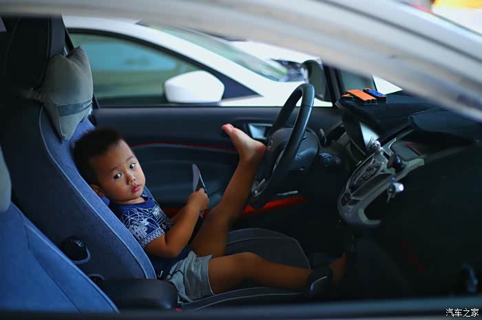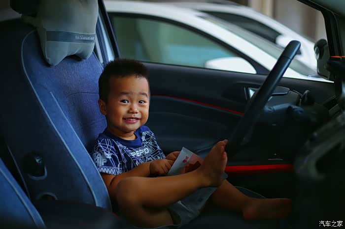 车辆熄火状态下,让弟弟坐在主驾驶位,感受司机视角。