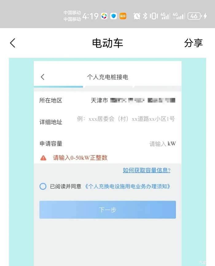 以上材料都如实提供好以后,申请新能源电表的程序就进入电力公司审核阶段了。这个审核时间一般在1-3天内完成,材料准确无误的话,电力公司便会受理你的申请,同步会在APP上显示“受理签约”状态,后续就会有电力公司人员上门来实地查看车位情况,并开始电表安装施工。