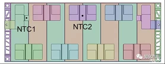 共计14个模组,每个模组由8个电芯构成,模组上布置有2个温度传感器,它的位置如下图所示: