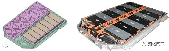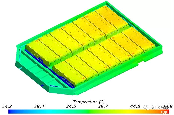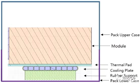 整个管路设计是由一侧进水,另一侧出水,每个模组的下方有8根并联的口琴管,从电芯到冷板之间的传热路径是:电芯-模组底部(绝缘贴膜,为无底板方案)-导热垫-冷板,如下所示。