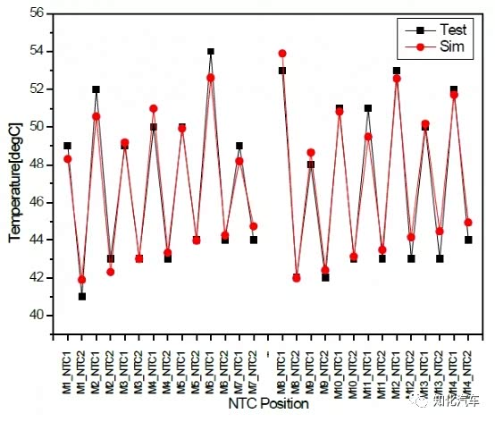 对整个电池包进行热仿真与测试验证的对比,如下图,可以看出,仿真与测试的结构基本一致,最高的温度出现在第8个模组M8的1号温度采样点NTC1为53.9℃,仿真与测试的最大温差为1.4℃。
