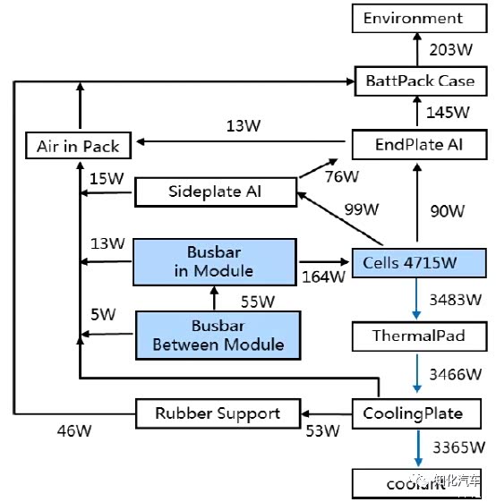 有了这样一个仿真,便可以对电池包内各环节的产热、散热情况进行定量地探讨。从下图的产热-散热功率图能够看出: