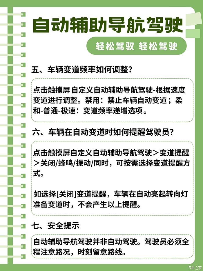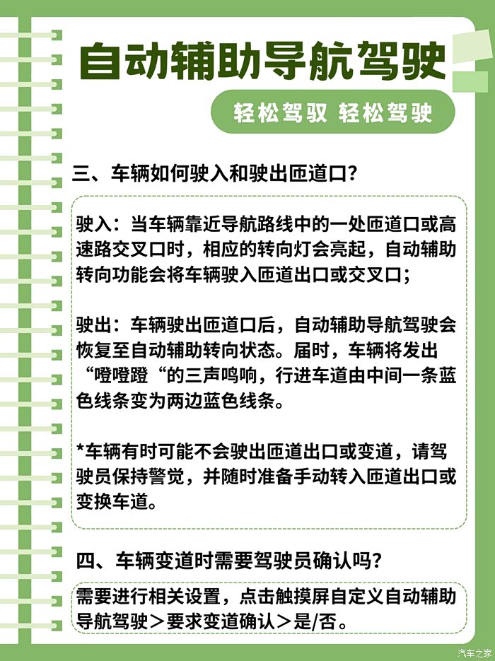 车辆在部分高速公路或高架等封闭路段行驶时,结合车载导航路线让车辆进行自动变道、自动进入和驶出匝道口的功能。 使用方法如下: