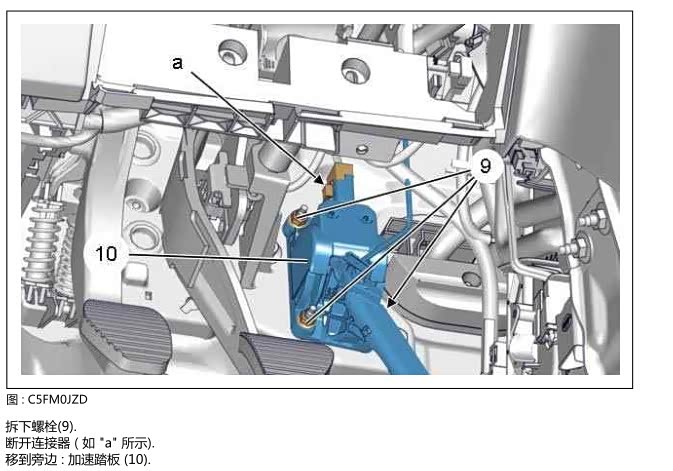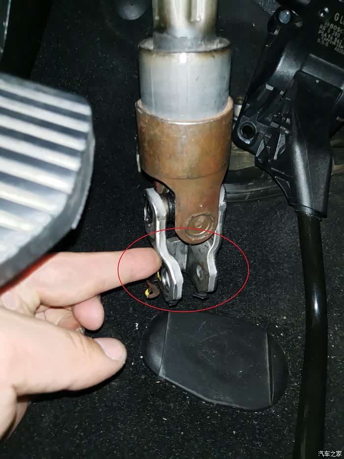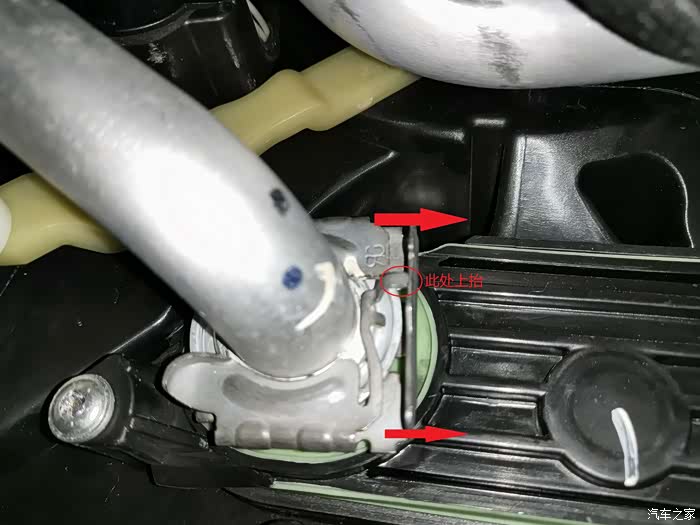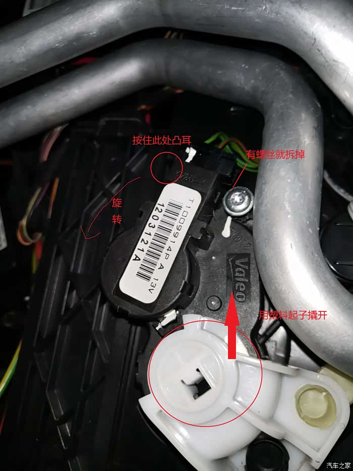 拆掉座驾下面盖板和出风管,拿掉暖气管内侧固定卡扣