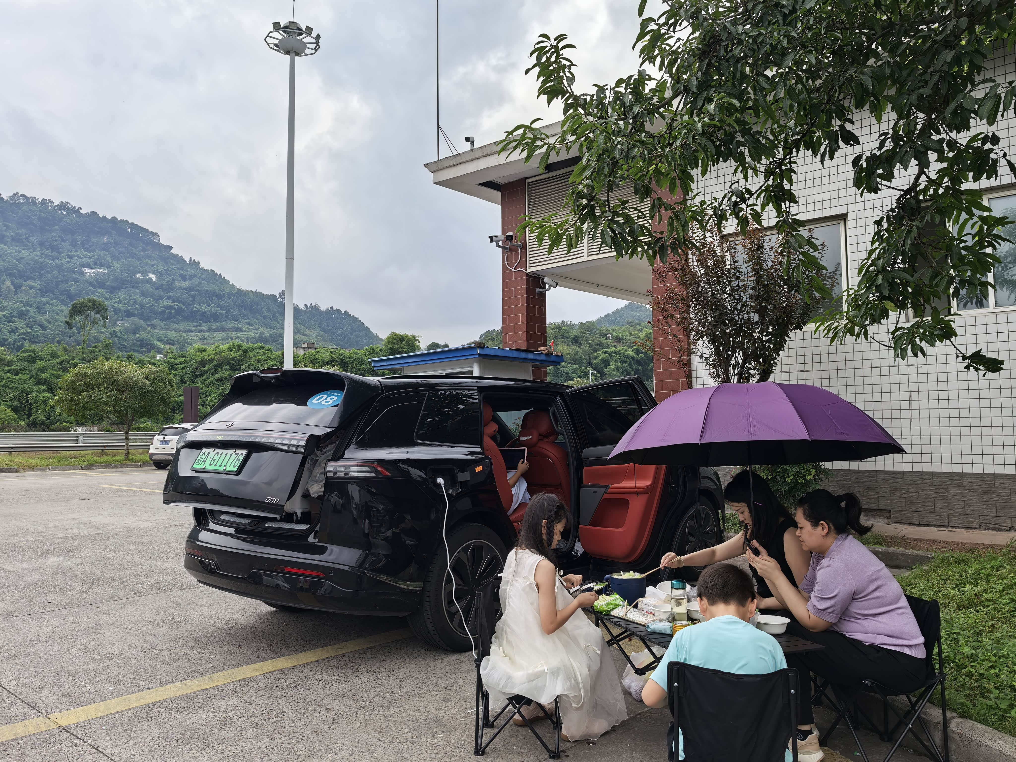 高速路上,服务区里人还是很多,大多数人都是吃泡面,桌椅也不够用。而我们选择在停车场摆好桌椅,并打开车辆的外放电功能,用电煮锅煮面吃。