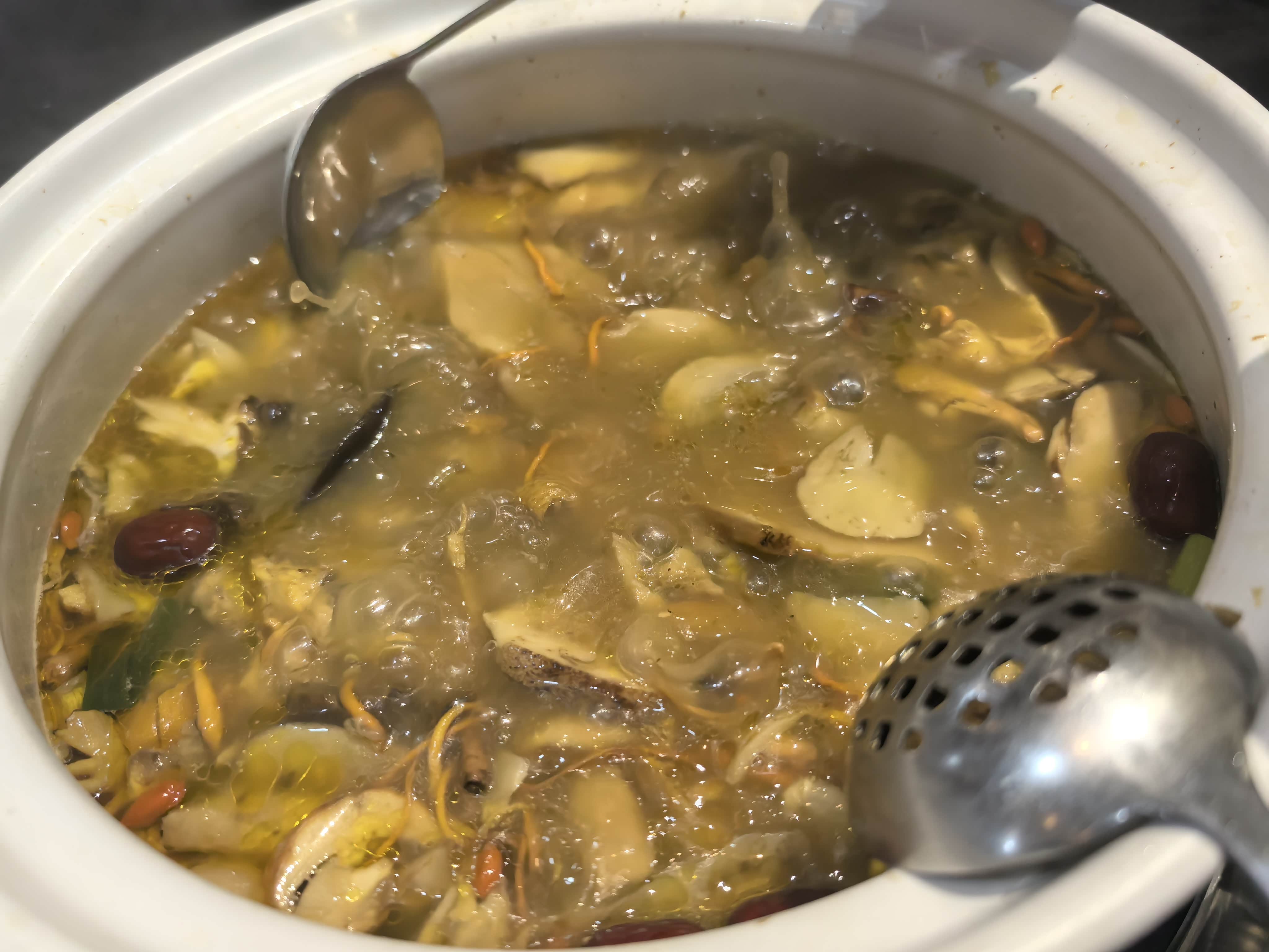 3)野生菌鸡汤,第一次看见这么多的菌,和乌鸡一起煮汤,味道特别鲜美。