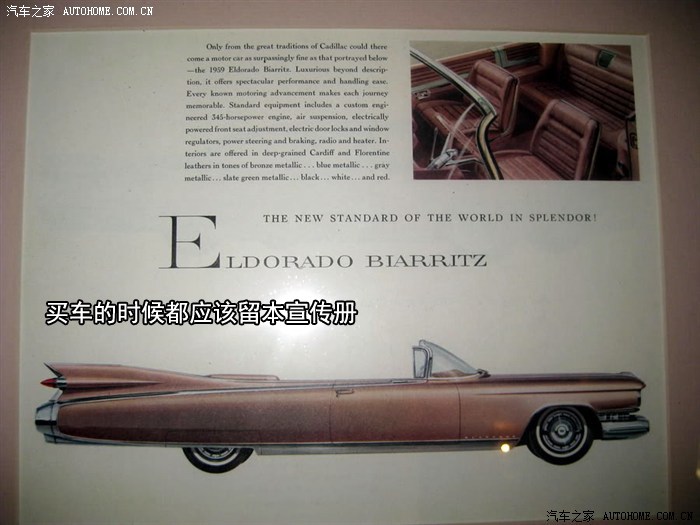 凯迪拉克Eldorado系列轿车起源于1953年,在其诞生之时,便以真皮装饰、收音机、电加热、风挡玻璃喷洗器、液压自动变速器、助力转向和后轮白胎壁轮胎等诸多奢侈配备和将近8000美元的基准价格成为通用汽车乃至整个底特律当时生产的最华贵的轿车。问世50年来,Eldorado曾经拥有过两种风格的外观。第一种是以常规凯迪拉克后轮驱动车型为基础的改进型,拥有强劲的动力。第二种则在造型上完全突破,采用前轮驱动、前后车厢隔断的敞篷车设计,带来了完全个性化的全新风格。1959年,作为凯迪拉克Eldorado系列轿车的新作,采用创新“火箭”造型的带有鲨鱼鳍的Eldorado诞生于美国底特律。独特而出众的外观,使该车自诞生起,便风靡全美。当时,凯迪拉克占有美国国内豪华车市场60%的份额。该车在当时极尽奢华,最低配置便包括空气悬挂、自动门锁、雾灯、带记忆功能的六向电动加热座椅、带遥控器的收音机、电动车窗和白壁轮胎,选装件中更包括空调、巡航系统、自动调低前灯亮度的切换系统以及深色或彩色玻璃窗。所有可以想象的豪华设备在车上应有尽有。这也就难怪当年最便宜的一款Eldorado也要卖到5455美元。而限量版的Eldorado Biarritz,由于装饰了更多的铬合金,配备了更强大的助力装置,还专门提供了桶式前排座椅供免费选装,零售价更是高达7401美元。此次参展的凯迪拉克El Dorado Biarritz经典敞篷车长达5.715米,轴距达到3302毫米,车重2.2吨。它配置了6.4L V8发动机和四速Roto Hydra-Matic变速箱,最大功率达到345马力,成为名副其实的“豪华经典”。这就是凯迪拉克Eldorado。看到它,我们就会希望能坐在其中,放下车篷,把巡航速度定在每小时75英里,去聆听“猫王”或玛莉莲·梦露的绝美歌声。