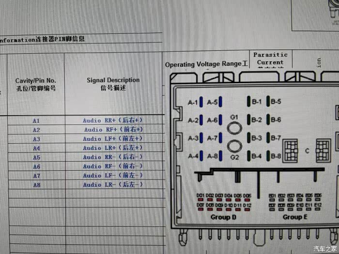 工程师给的喇叭接线图,我把高音喇叭并联在中门的喇叭线上,之前按低音炮用的无损插头上破线并联,不破坏原车线路。一定要确定好正负极,接反了影响效果。