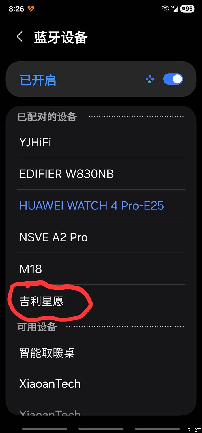 在如果选项里添加蓝牙设备,找到吉利星愿蓝牙,勾选即可。