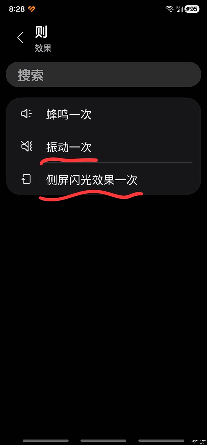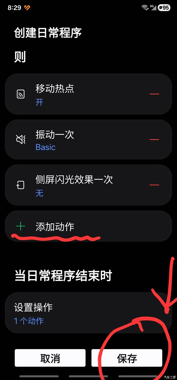 这里添加动作根据自己爱好可以进行多次添加动作 ,我觉得有振动和闪光就可以了,然后选择保存,保存后每当你上车你的手机蓝牙和热点会自动打开分享给车机,这样就完美解决了每次上下车都要手动开启和关闭的繁琐操作。同理,如果大家需要设置下车自动关闭蓝牙和热点,请按照上述步骤操作即可,但要注意要选择驾驶已结束选项,然后勾选关闭蓝牙和热点功能即可完成。