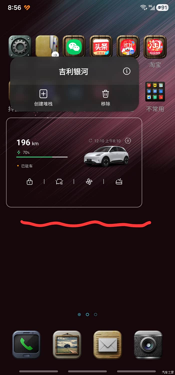 接下来在手机屏幕长按空白处,选择小程序,选择吉利银河小程序图标。