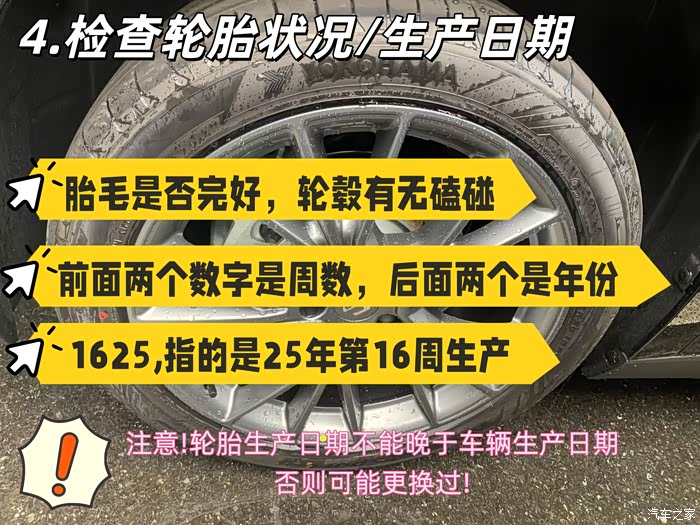 车身漆面与覆盖件:环境选择: 将车辆移至光线充足的环境下,逆光与顺光角度各检查一遍。检查内容: 环绕车身一周,仔细查看前后保险杠、车门、翼子板等部位有无划痕、凹陷、色差及橘皮纹。接缝均匀度: 检查引擎盖、车门、后备箱与车身之间的缝隙是否均匀、对称。玻璃与车窗:状况检查: 查看前后风挡、车门玻璃及天幕玻璃有无裂纹、气泡、暗病或明显划痕。生产日期: 玻璃角标数字代表年份,点代表月份(点在数字前用7减,点在数字后用13减)。各块玻璃生产日期应接近且早于整车生产日期。轮胎与轮毂:轮胎检查: 查看胎壁有无损伤、磨损,胎毛是否大致完好。核对轮胎生产日期(DOT后四位,如“2524”为24年第25周)。轮毂检查: 检查轮毂表面有无运输或挪车过程中造成的磕碰、刮擦。