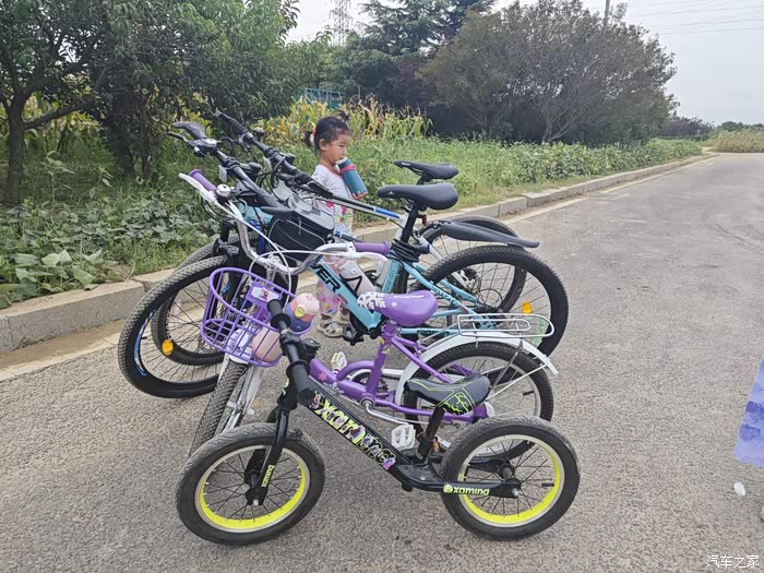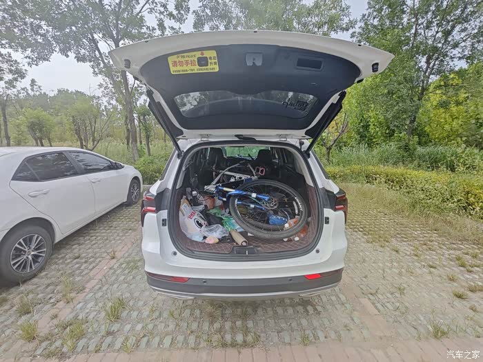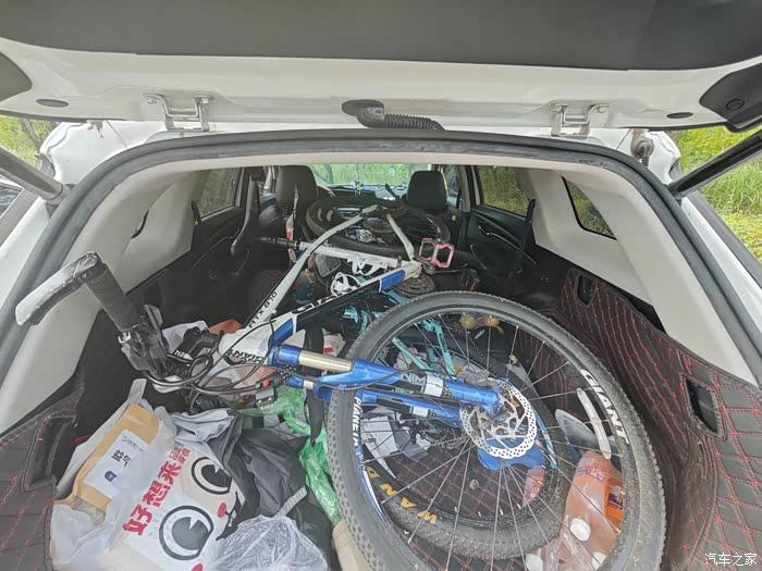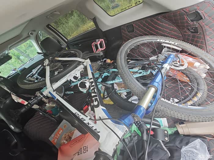 长安CS75P,宽敞大气的车身,为我们提供了充足的空间,我们把后排座椅轻松放倒,让我们可以轻松地把两辆自行车放进车里。重叠摆放在后备厢里,然后放上两个孩子的小骑行车,满满当当的,SUV就是空间够大。