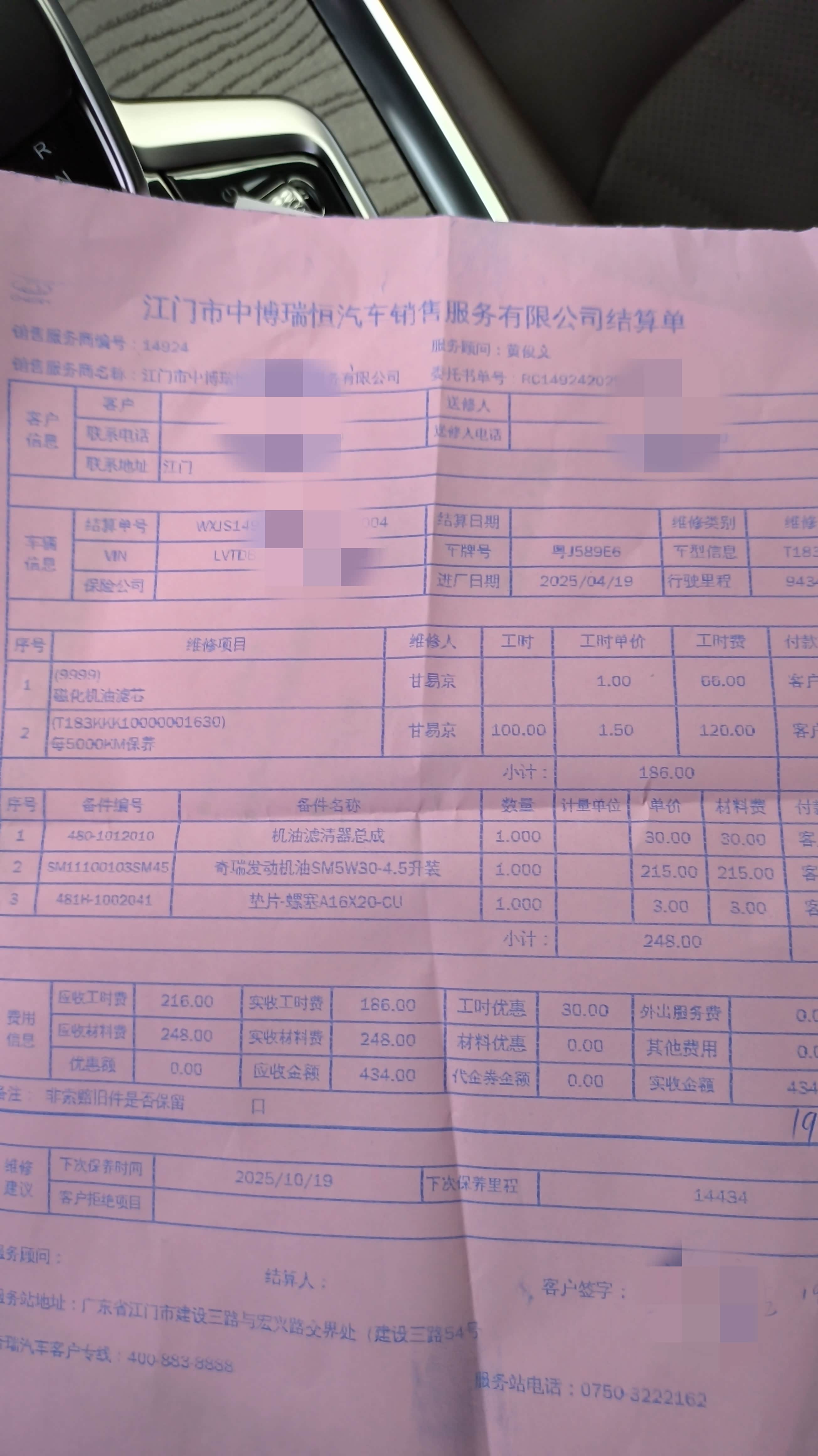 先说说保养,毕竟车要定期维护才能开得省心。这一年我一共做了两次基础保养,都是按照厂家建议的里程去的,每次保养费用大概200块钱左右,两次下来就是400块。保养项目主要是换机油、机滤,还有常规的车况检查,像刹车、轮胎、油液这些都会仔细看一遍。对于一台五座SUV来说,这个保养价格真的很亲民,普通家庭完全能承受,而且保养后开着也更放心,带娃出门安全感拉满。