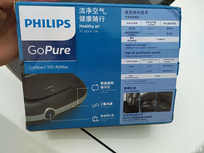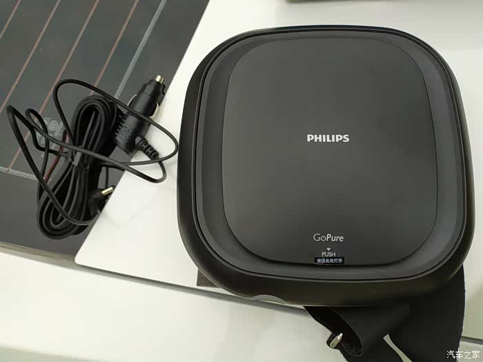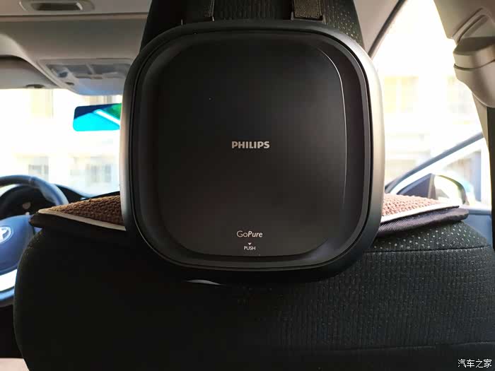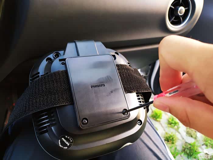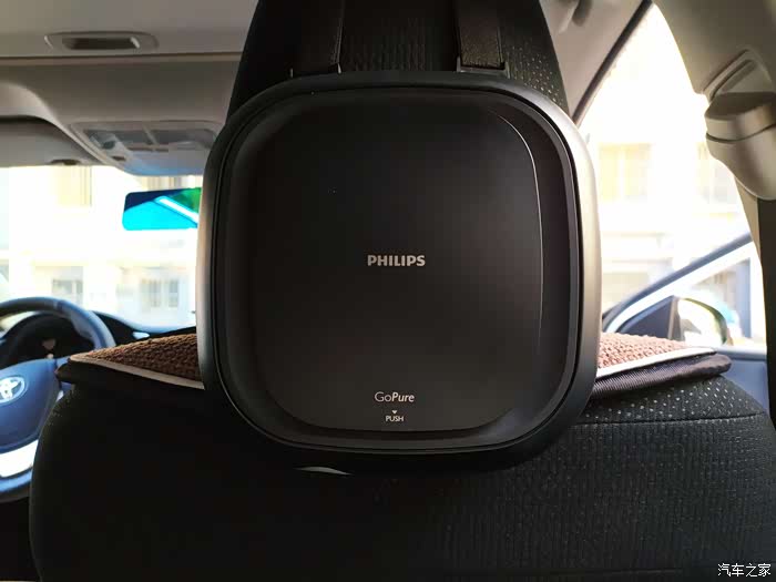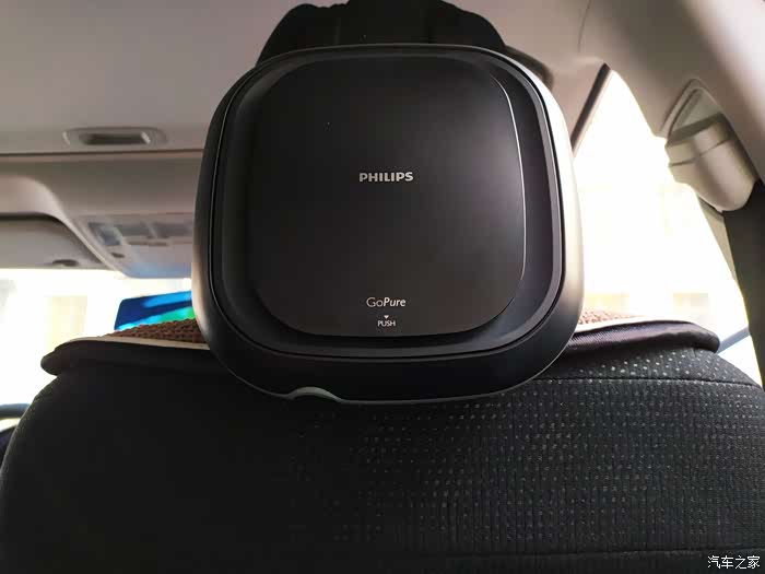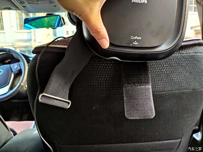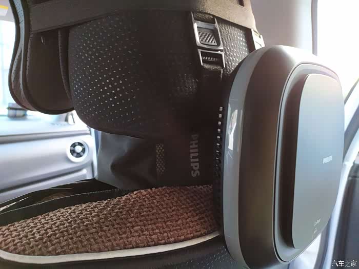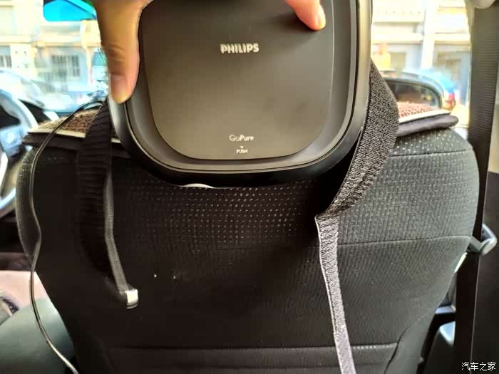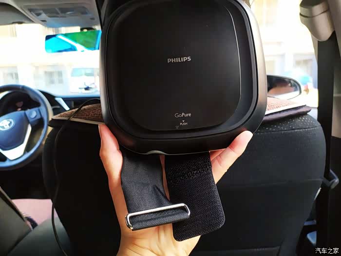 这款就是我前面提到的用在我自己车子上的净化器啦,同样是家家活动所得,飞利浦品牌,从品牌上自然也可以看出也要比我闲置的那一款净化器好一些。功能上有高低速档位,而且外观形状上也比较美观,自带绑带,可以方便的固定在中央扶手或者座椅颈部位置,固定也比较牢靠。