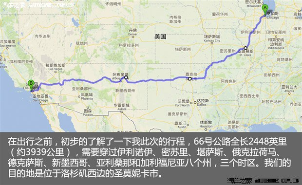 人们喜欢这样定义她:横贯美国,从芝加哥到洛杉矶,全长约3939公里,横跨八大州,三个时区,美国梦的最好诠释。借用一张编辑苑叔的图,一目了然。