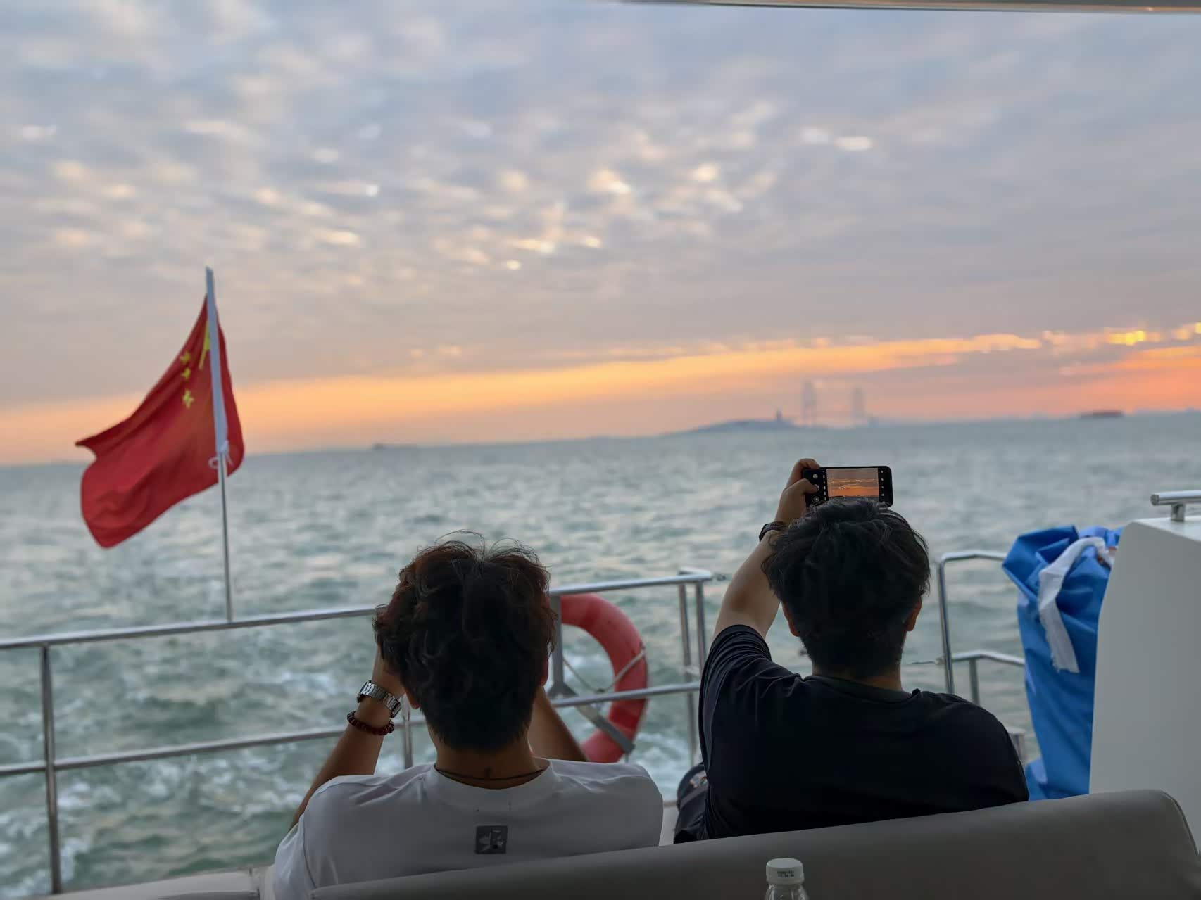 转场宝安机场码头游艇会时,车队再次展现“启源美学”。空旷的停车场内,十六台新能源车整齐排列,宛如等待出征的舰队。二十位车友分两批登上豪华游艇,首批未登船的车友在休息室开启“零食茶话会”,而出海组则抢占甲板最佳观景位。当深中通道如银色巨龙横跨海面时,夕阳恰好为这座世纪工程披上金纱。“原来从海上看深中通道是这样震撼!”车友们纷纷感叹,镜头对准这座承载中国基建梦想的超级工程。晚霞将天际染成橘红色,倒映在波光粼粼的海面上,游艇上的惊叹声与快门声交织成欢快的旋律。