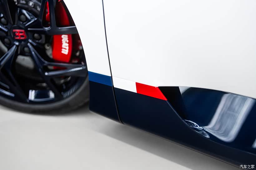 与全黑美学形成鲜明对比的是另一台纯白选装的W16 Mistral:这是一款双色调车身,“冰川白”的车身外漆,并搭配以“蓝碳”以及“大西洋蓝”和“意大利红”作为点缀,车侧还有条式法国国旗。在车内则搭配了“湖蓝”座椅缝线。
