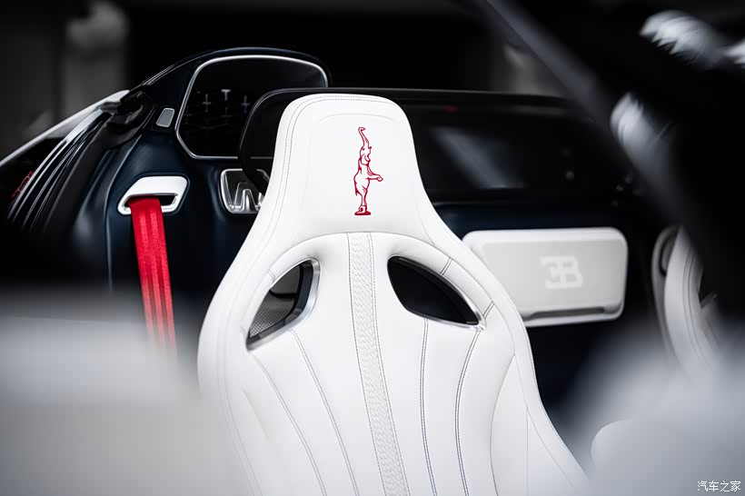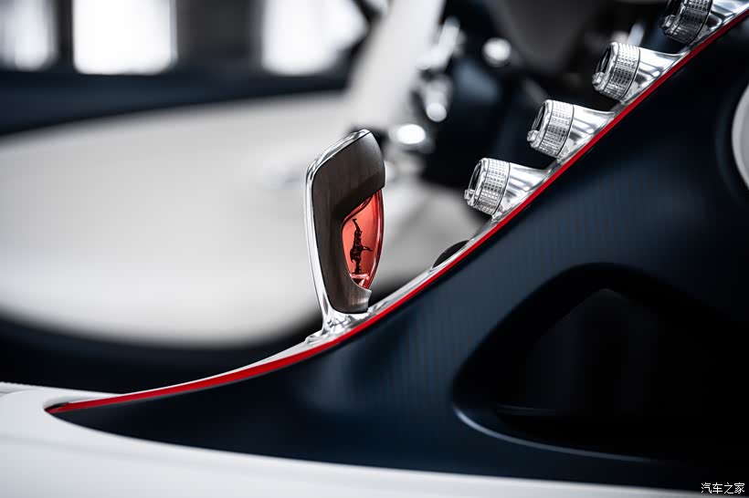 车内的档把上——镶嵌的“舞动的大象”是一件由整块铝加工而成的艺术品,为纪念Type 41 Royale。黑色W16 Mistral的大象雕塑呈现在透明玻璃中,并搭配以“布加迪浅蓝色”皮革制成;白色车辆的大象雕塑则被包裹在“意大利红”玻璃中,并搭配以手工制作的木材为辅——这既是客户的独特定制,也是布加迪的艺术表达。