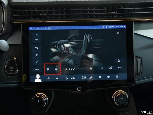3、点击屏幕左下侧的方框气流图标选项,开启后挡风玻璃除雾功能。