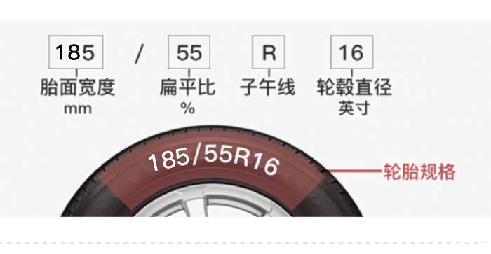 轮胎尺寸详解 185是胎面宽度,55是扁平比,R是子午线,16是轮毂直径。