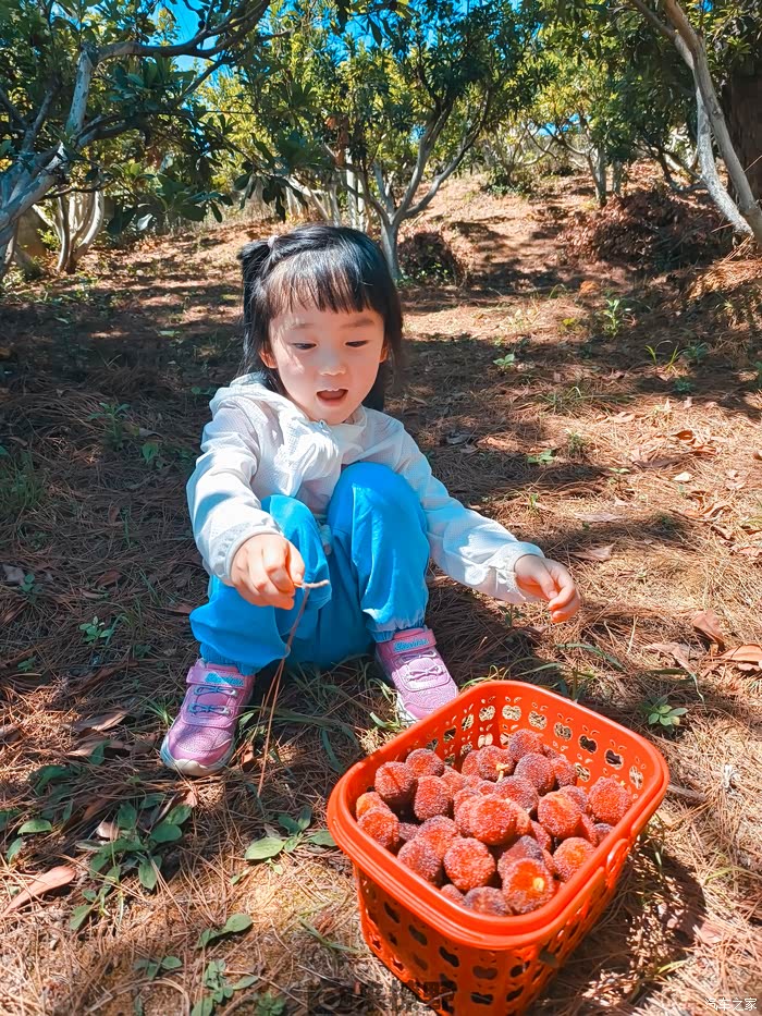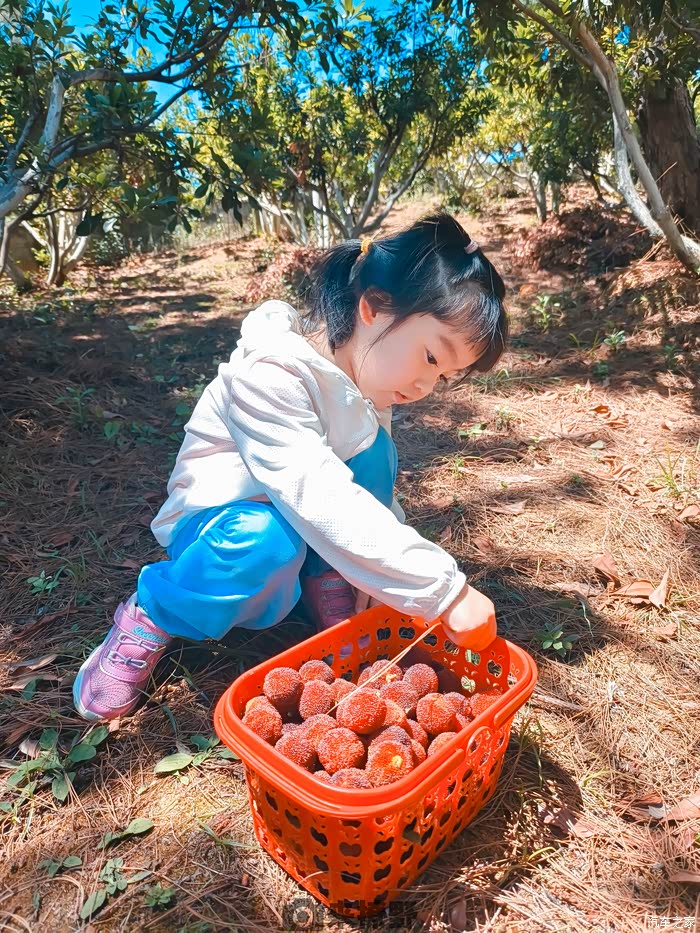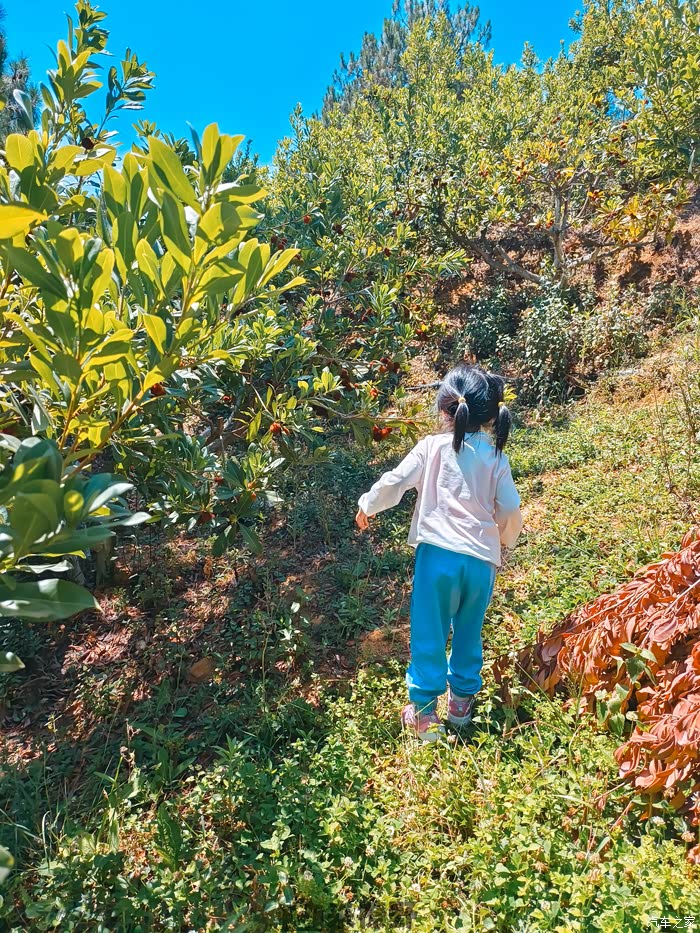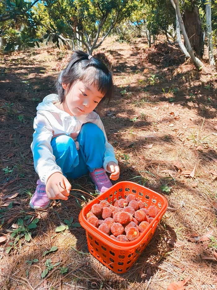 周末,虽然艳阳高照,还是带暖暖去摘杨梅。