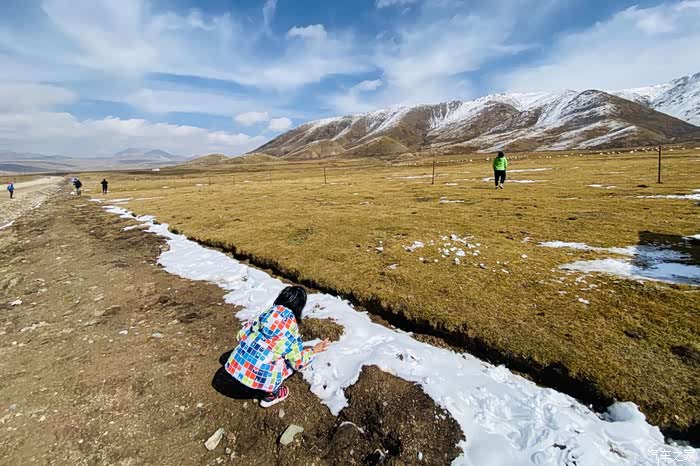 因为逐渐是能看到祁连山山脉了,路边出现了零零星星的雪。对于南方孩子来说,雪还是很让人兴奋的。于是我们会时不时停下来玩玩。