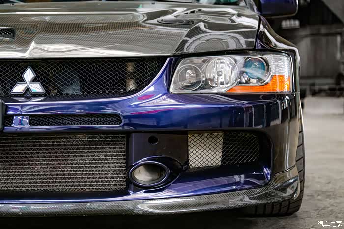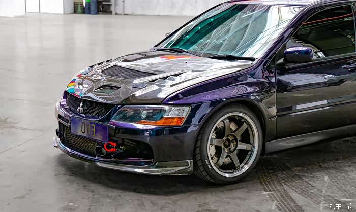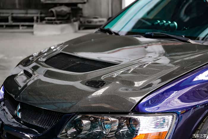 车头部分改装了碳纤维机盖、碳纤维前唇,机盖正中部的黑色网格是发动机的散热口,和翼豹机盖上部的进气口设计一样,同样源自WRC拉力赛场的征战需要,不同之处在于眼前的Evo9机盖上的口只用于散热,中冷器置于前杠下部,而翼豹由于水平对置发动机结构设计中冷器置于机盖中部位置不仅负责散热还需要为中冷器提供空气