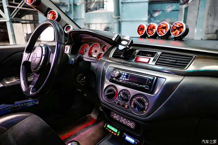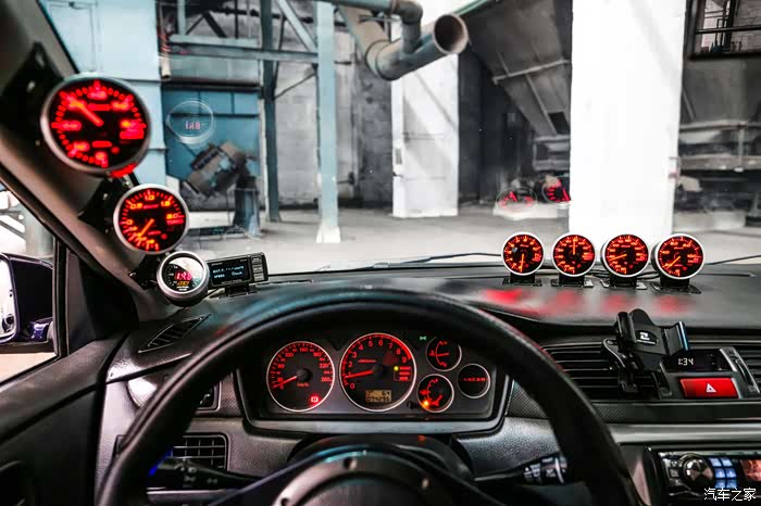 车内映入眼帘的是Defi的连表,左边三个中间四个与仪表盘同色,中控下部是Tein悬挂控制以及Greddy的涡轮控制,当你感觉这一切纷繁杂目时,说明你已忘却最初的简单,在Carplay以及触控交互系统普及之前的内饰。纯粹是内饰方面给人最直观的感受,仪表盘并未像多数Evo9改装案例那样更换Ralliart的仪表