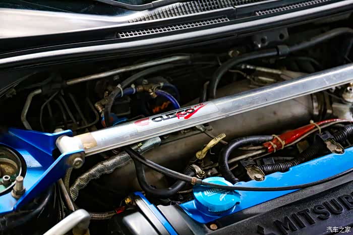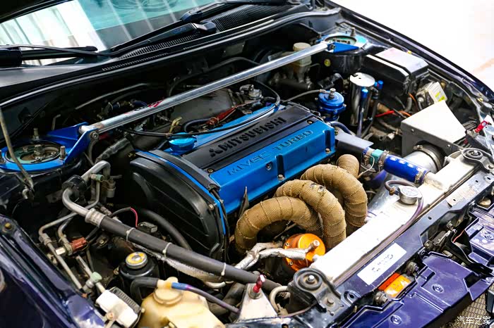 改装重心在动力系统,,4G63T作为铸铁发动机虽然质量大,但是高强度的缸体以及水道设计带来了巨大的改装潜力,原厂的4G63T排量2.0T,可输出280匹马力,眼前的机头大刀阔斧改装后输出在730匹马力左右,早期将原厂2.0排量缸体进行了2.4的扩缸、锻造,同时更换了更大的AMS 5858涡轮,从包裹隔热布的芭蕉就能看出绝非等闲之辈
