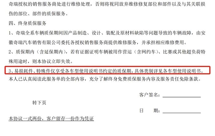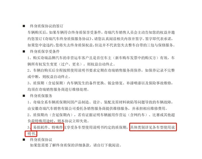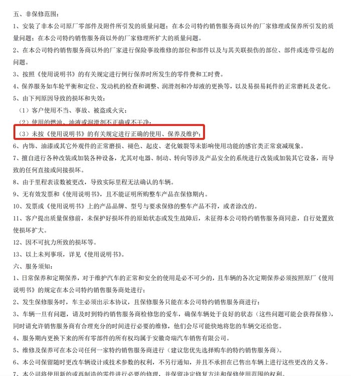 而第4点,就更复杂了,我们常规知道的质保主要就是说的发动机,变速箱,底盘嘛,但是,这个只是一个大的范畴,没有细化,说白了,是否属于整车范围就是厂家说了算,因为,游戏规则中写得很详细了,“特殊件”,什么是特殊件,汽车减震是不是属于特殊件?整车质保书中有没有写清楚,至少我目前没有看见过详细得说明。当然,如果有网友已经买了瑞虎9,也签了并且得到了整车质保相关资料,还请发出来,大家看看。