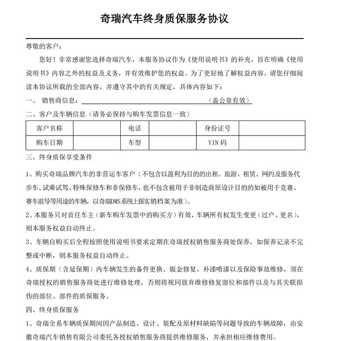 首先说3,全程在4S保养,这个没问题,就是要保障和让厂家掌握车辆使用的全生命周期的情况,但是,具体是多少公里或多少时间保养一次(小保养哈),每次保养多少钱(比如瑞虎9),这些东西规则,是否清晰明确写在了这个终身整车质保的相关文件中,并客户,4S 签字盖章生效?厂家是否官方认可?