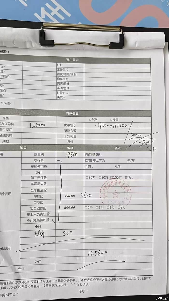 店里买车政策是贷款比全款要优惠两千,而且三年贷款没有利息,我和妻子果断选择了贷款分期付款买车,到现在也没搞清楚为什么贷款会比全款买车便宜😂,在跟销售人员一番讨价还价后 裸车价最终谈定了 108000 元(指导价 125700 元),最终落地价 为 122406 元(含商业保险 3038 元、交强险 950 元、购置税 9558 元、上牌费 150 元、等),我选择了 36 期还完,首付付了 68000,每个月还 1600 多一点,这对于我们家庭来说也能减轻一些压力,店里还给赠送了全车贴膜和脚垫等,总体还是挺满意的。