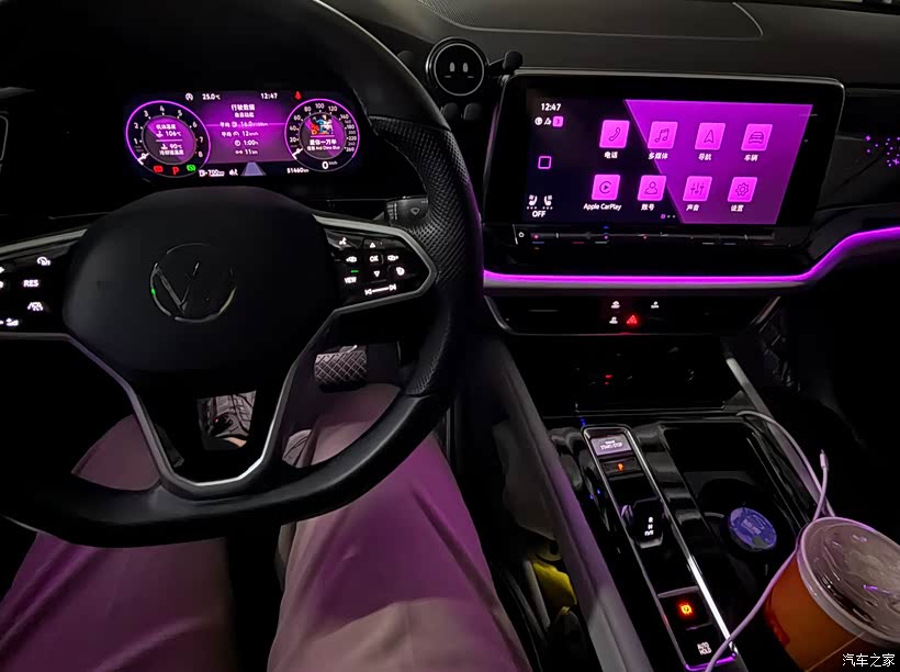 * 用料&氛围:途昂的内饰质感藏在每一处细节里,深色内饰耐脏又显沉稳,中控台、门板等经常触摸的区域都覆盖了大面积软质搪塑材质,用手轻轻按压能感受到明显的回弹,触感细腻不生硬,完全没有廉价的硬塑料感。最让人惊喜的是32色可调氛围灯,能根据不同场景切换风格——夜晚开车时调至暖黄色,柔和的光线从门板、中控台下方缓缓晕开,车内瞬间被温馨包裹,小朋友坐在后排指着灯光说“咱们的车里面像挂了小灯笼”,稚嫩的话语让每次出行都多了份暖意;切换成冷色调又能添几分科技感,不管是日常通勤还是长途自驾,都能适配不同心情。